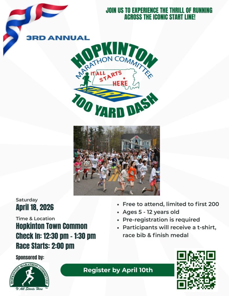 The third annual 100-yard dash for ages 5 to 12 will be held at the Town Common! More information and registration at this link: https://hopkintonma.myrec.com/documents/2026_100791x1024.jpg