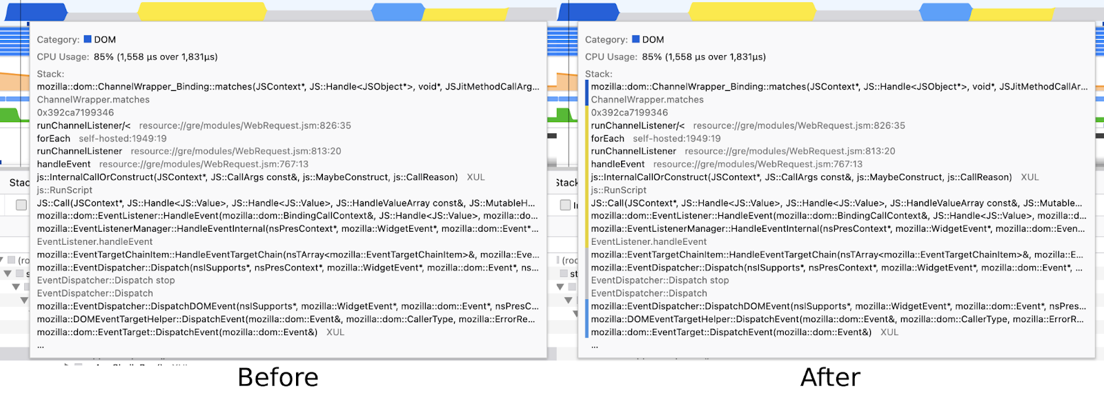 Stacks now include the category color of each stack frame (in tooltips, marker table, sidebar)