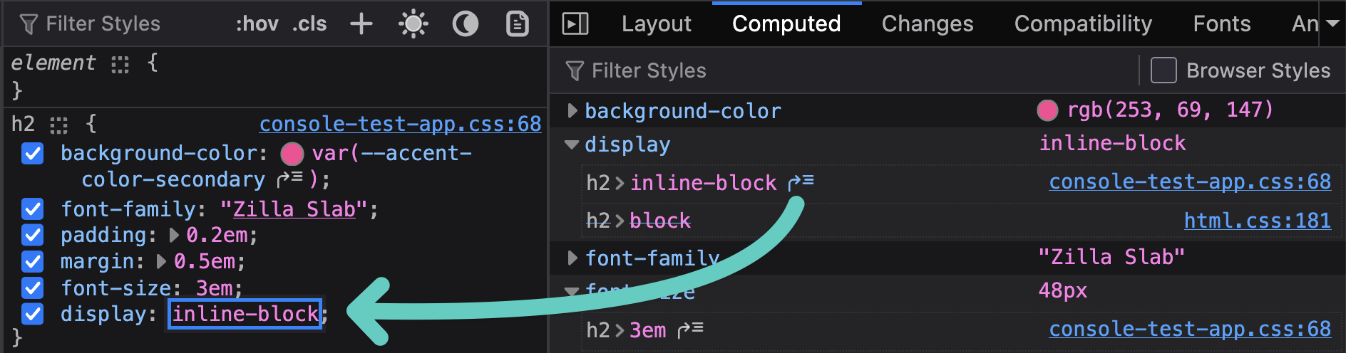 alt text: New button in DevTools Computed panel for a rule "inline-block" and its related declaration within the Rules panel