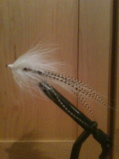 After watching a video of a popsicle fly moving through the water (Rob's earlier post), I threw some materials together with spun marabou into a squid fly. Barbell eyes are a bit more hidden than I'd like them to be, but in water they should more visible. And might have been doing it wrong, but spinning the marabou was really difficult.