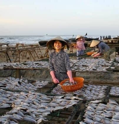 Một lần về Phước Hải (Bà Rịa) thăm người bạn cũ, tui ghé qua làng chài định mua ít cá trích tươi về làm món gỏi cá trích cuốn bánh tráng rau sống, chuối chát, còn lại kho rục với mía ăn với bánh mì. Lòng vòng trong làng chài một hồi mà không tìm thấy chổ nào có bán cá trích, tui thả bộ dọc theo bãi biển định đi dạo một chút rồi về, chợt thấy có một dãy giàn tre phơi cá khô. Có một cô gái đang gom những con cá khô trên giàn vào một cái rổ. Nhìn thấy tôi, cô gái nói : “mua cá khô về trộn gỏi xoài nhậu đi anh, cá em phơi tại nhà ngon lắm, không mặn đâu”. Thấy tui hơi lừng khừng, cô nói thêm: “cá này em vừa phơi xong 3 nắng, ăn rất ngọt nờ anh”. Nghe giọng nói ngọt ngào dễ mến của cô gái quê Phước Hải, tui dừng lại ngắm nghía những con cá khô đù trong rổ mà cô vừa lựa vào để bán. Cô gái giải thích thêm :”cá này là của cha em thả lưới ngoài biển, anh mua về nướng lên ăn cơm hoặc xé ra trộn với xoài sống, khế chua, nhậu ngon hết sẩy, anh mua đi, em bán nới cho nờ” (“nới” là bán giá phải chăng, “nờ” là tiếng đệm cuối câu mà người dân Phước Hải hay dùng). Tui hỏi cô có bán cá trích tươi không, cô nói : “mùa này biển chưa có cá trích, may ra tháng tới mới có nờ”.