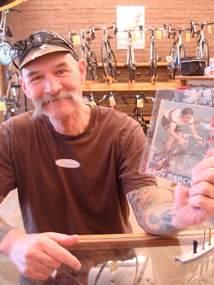 I'm sure I don't have to tell you how awesome Steve Gitchell is. Just in case you are out of the loop and/or have been living under a rock, I'll tell you.... he is cooler then we could ever hope to be. Today, he said he's sick of coming into our bike shop and not seeing a picture of Eddy Merckx, so he (being a man of action) brought in a signed picture of the Cannibal himself. Best. Ever.