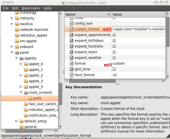 ![]() configuration editor The result : ![]() small and space efficient clock This format may not what you want. If you want to have different format, read here and here for more formats and tags. I wrote something like this earlier, but this time I found a way to make it smaller i.e. by inserting "small" tag inside <span size="smaller"> and using monospace font ("tt" tag). keyword : custom clock, ubuntu, gnome |