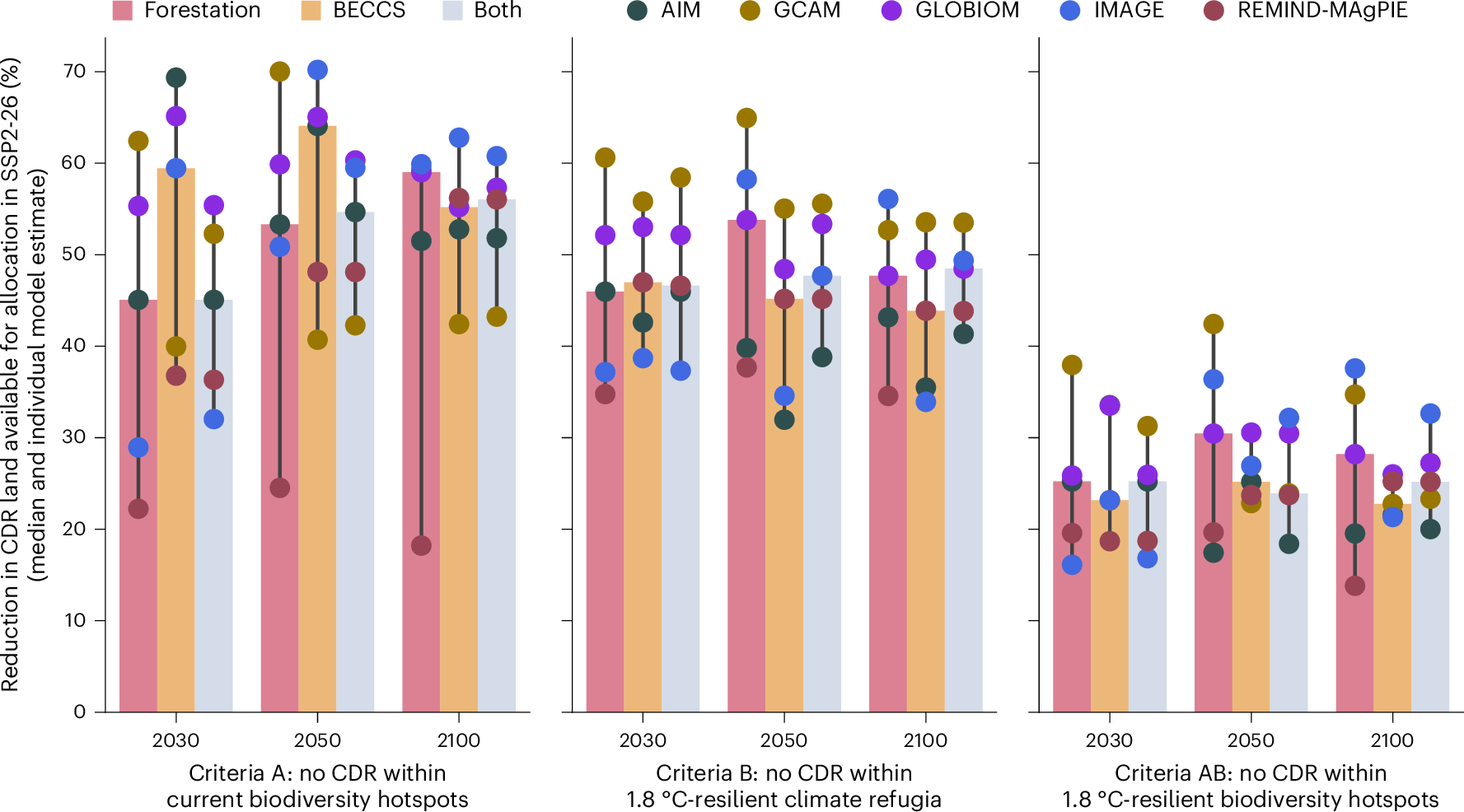 Authors: Ruben Prütz, Joeri Rogelj, Gaurav Ganti, Jeff Price, Rachel Warren, Nicole Forstenhäusler, et al.Synopsis: Analyzing five integrated assessment models, this study finds that 1.5 °C pathways could allocate up to 13% of global high-biodiversity areas to land-intensive CDR, with disproportionate impacts in low- and middle-income countries. Protecting biodiversity hotspots would make over half of planned forestation and BECCS land unavailable unless synergies are pursued, highlighting trade-offs between climate mitigation, conservation, and CDR benefits from avoided warming.