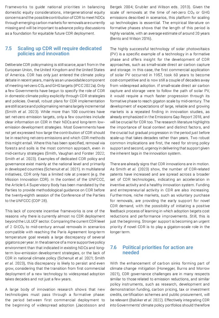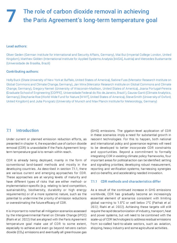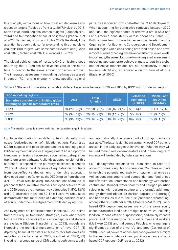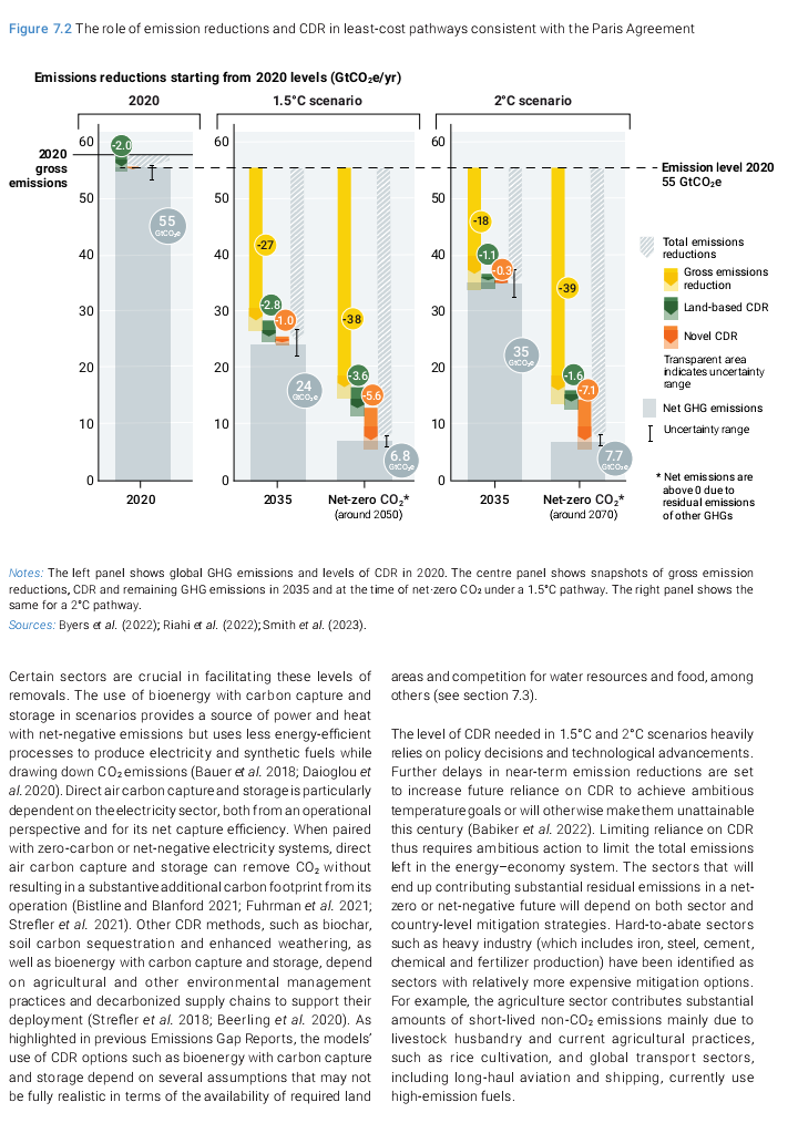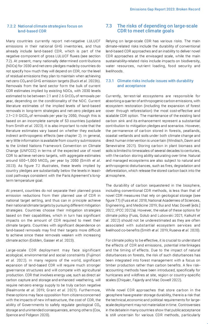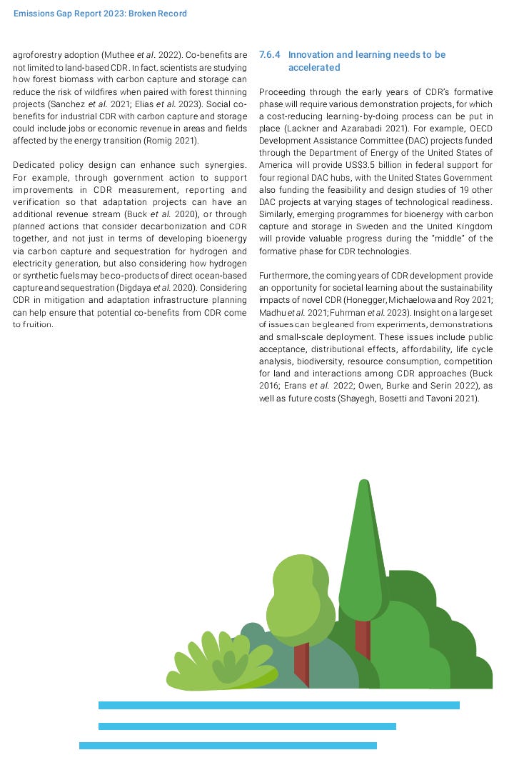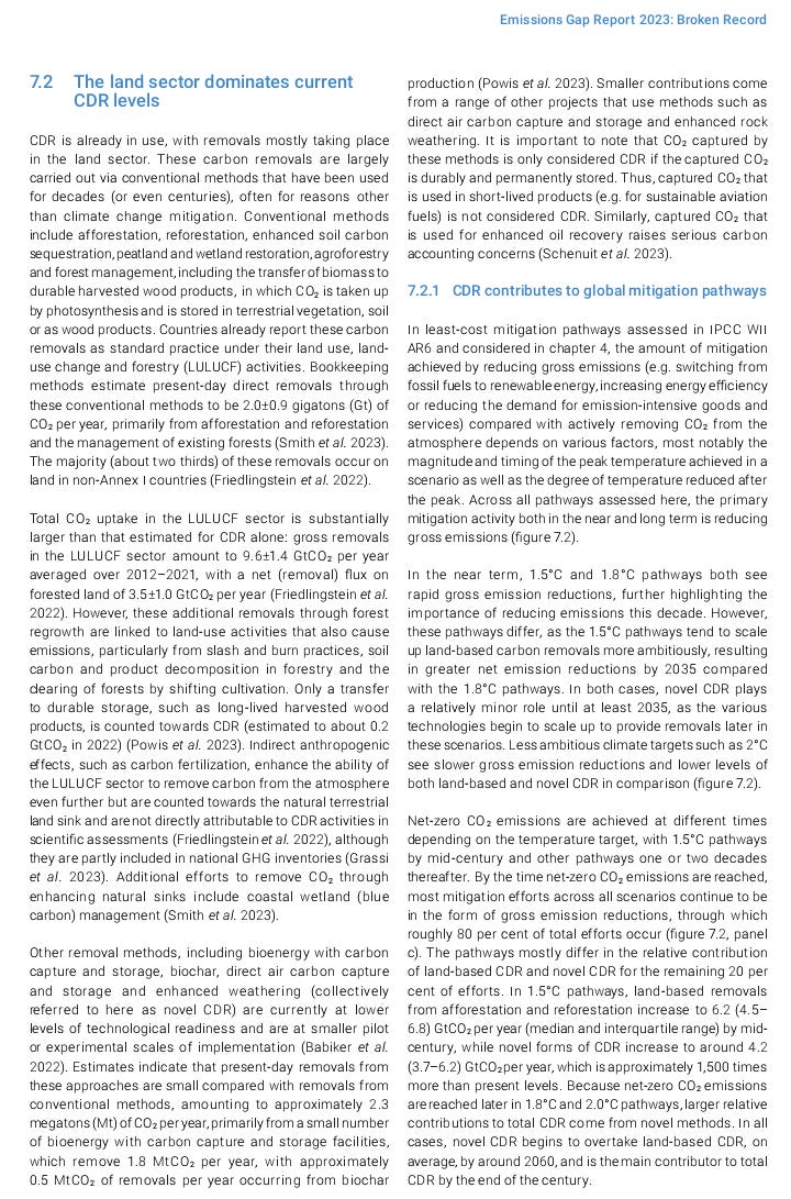 This item and others will be in the weekly “Carbon Removal Updates Substack” newsletter: https://carbonremovalupdates.substack.com/ ----------------------------------------------------------------- https://www.unep.org/resources/emissions-gap-report-2023 Authors: UNEP 20 November 2023 ![]() As greenhouse gas emissions hit new highs, temperature records tumble and climate impacts intensify, the Emissions Gap Report 2023: Broken Record – Temperatures hit new highs, yet world fails to cut emissions (again) finds that the world is heading for a temperature rise far above the Paris Agreement goals unless countries deliver more than they have promised. The report is the 14th edition in a series that brings together many of the world’s top climate scientists to look at future trends in greenhouse gas emissions and provide potential solutions to the challenge of global warming. What’s new in this year’s report The report finds that there has been progress since the Paris Agreement was signed in 2015. Greenhouse gas emissions in 2030, based on policies in place, were projected to increase by 16 per cent at the time of the agreement’s adoption. Today, the projected increase is 3 per cent. However, predicted 2030 greenhouse gas emissions still must fall by 28 per cent for the Paris Agreement 2°C pathway and 42 per cent for the 1.5°C pathway. As things stand, fully implementing unconditional Nationally Determined Contributions (NDCs) made under the Paris Agreement would put the world on track for limiting temperature rise to 2.9°C above pre-industrial levels this century. Fully implementing conditional NDCs would lower this to 2.5°C. The report calls for all nations to accelerate economy-wide, low-carbon development transformations. Countries with greater capacity and responsibility for emissions will need to take more ambitious action and support developing nations as they pursue low-emissions development growth. The report looks at how stronger implementation can increase the chances of the next round of NDCs, due in 2025, bringing down greenhouse gas emissions in 2035 to levels consistent with 2°C and 1.5°C pathways. It also looks at the potential and risks of Carbon Dioxide Removal methods – such as nature-based solutions and direct air carbon capture and storage. Source: UNEP |