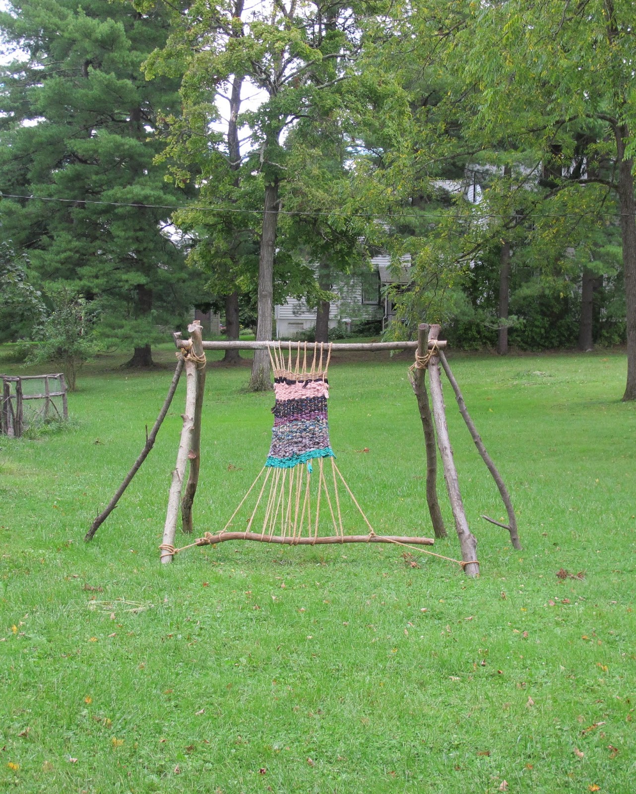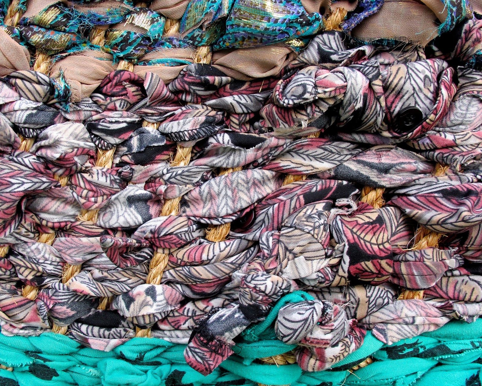 | Detail of weaving project. Summers scarf, silk shirt, 70's polyester shirt and the one she gave me. |