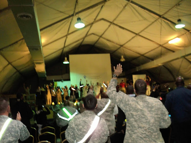 that the crowd wasn't nearly as big as the ones that showed up to see the Ultimate Fighting, Heavy Metal or Country & Western. Although fewer in numbers there was simply no comparison to the joy, spirit and meaning they were able to bring to all of us who attended. Here you are stuck in this army camp in the middle of a wilderness during the holiday season and professional gospel singers are singing to you about lives that have known pain, loneliness & despair yet their voices are filled with hope, joy, and redemption. The lead singer claimed that he knew that the soldiers spirit had been sagging and he intended to fill our spirits with hope.