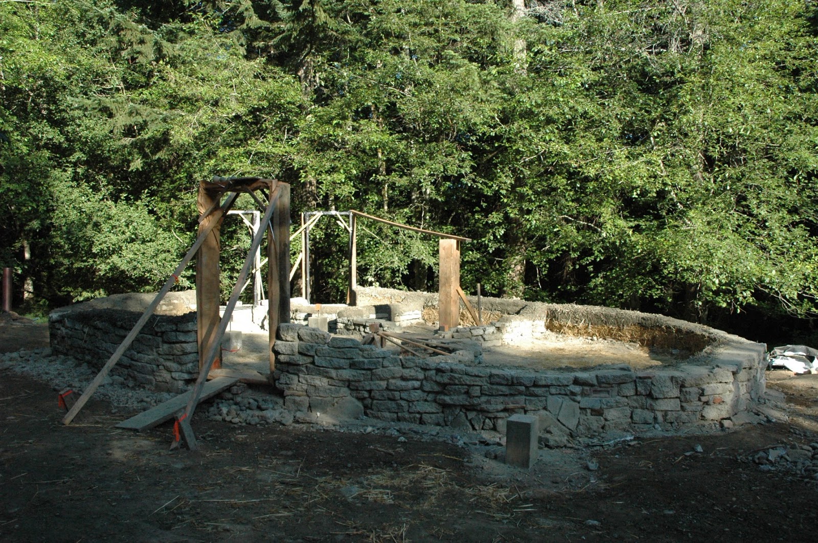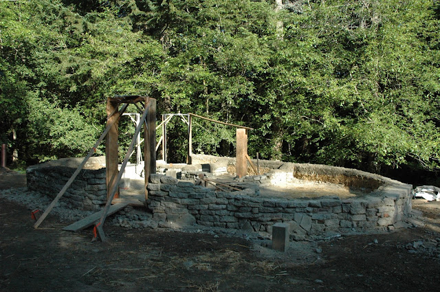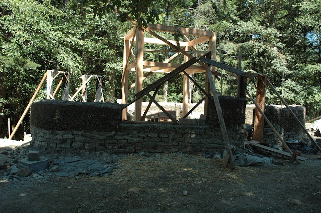 First, here's an update on the "Turtle House." Since the last post, we completed the foundation, including a a concrete bond beam, a substantial stem wall mortared with cement (the urbanite stacked on top of the bondbeam).