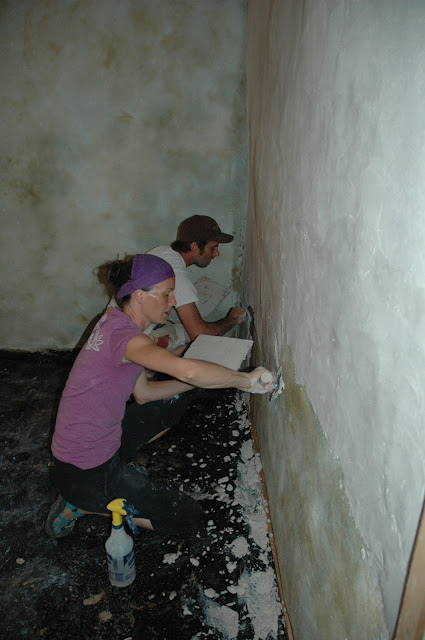 | Interns applying an exterior lime plaster to the root cellar with yogurt lids and gloves |