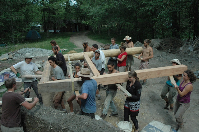 | Intern building team brought a bent (one assembled face of the timberframe) into the house to be raised |