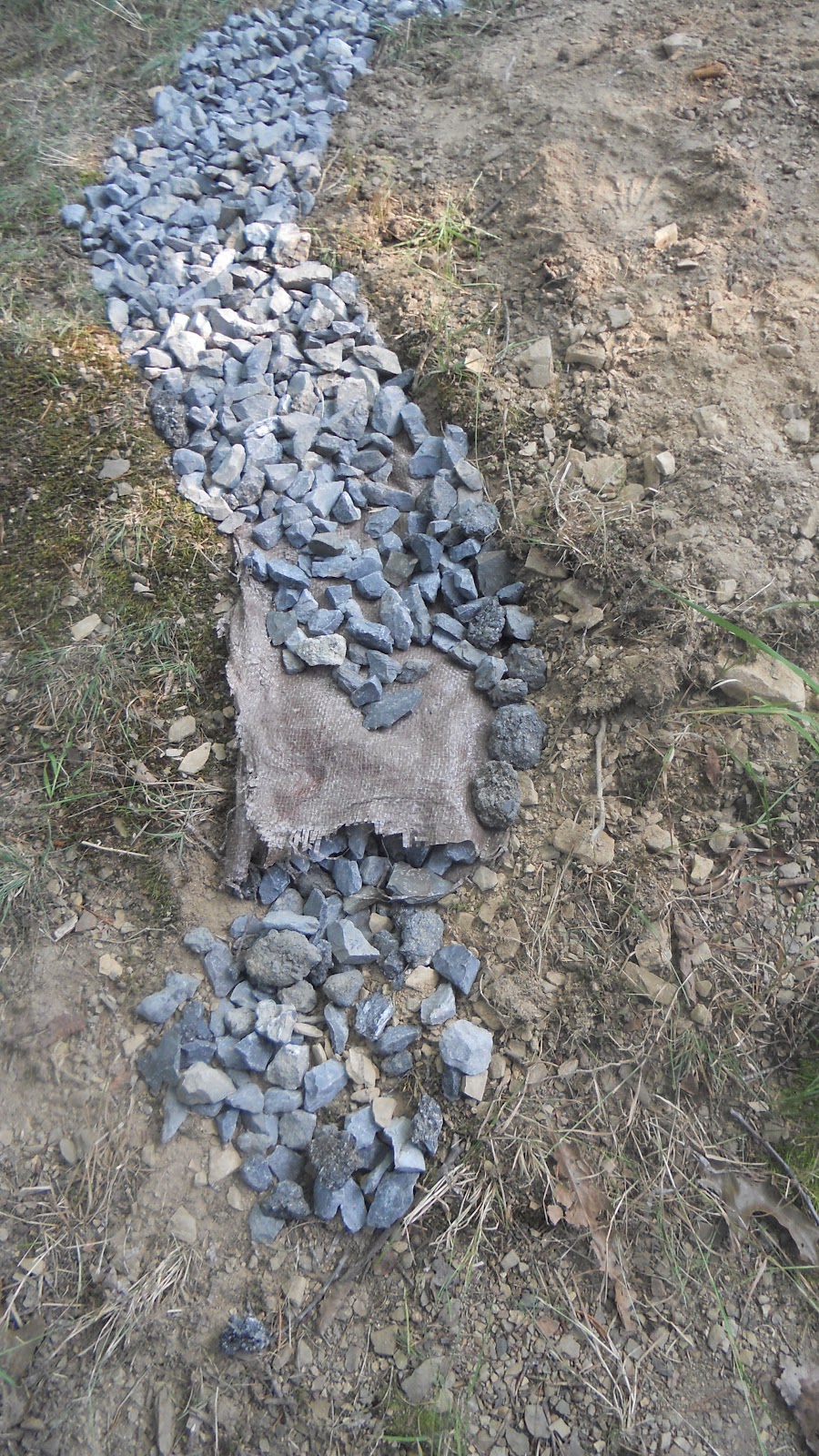 Then we added an old worn out tarp in the trench to keep most of the dirt and debris out of the drainage rocks.