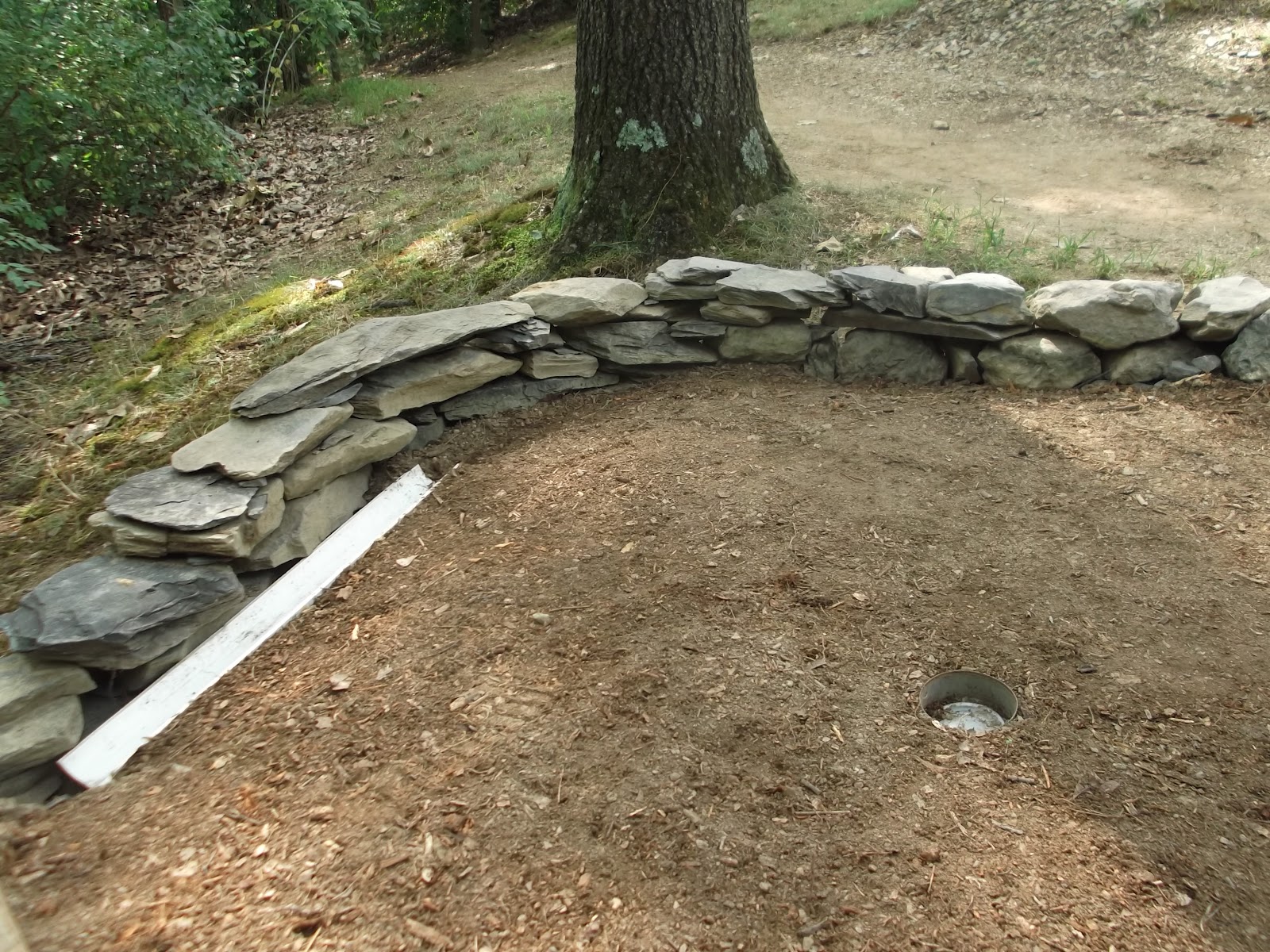 In the end, the wall turned out great! Then my dad finished out the design with a log and board holding up the fill dirt that leveled out the course and installed two drainage pipes that make the hole a tricky one! If you get your ball in the middle, good job and good score. If not, you are taking a trip into the woods!