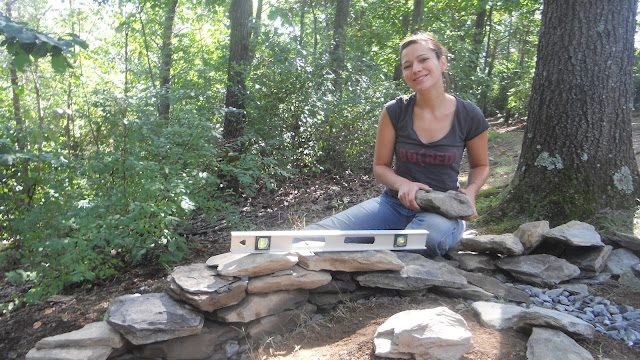 Then, we got to work collecting the materials for the stone part of the wall. Ultimately, we decided to save the cob part for another time because there wasn't time for it all. Since their long driveway is made of gravel and rocks, we were able to gather the drainage rocks from there. There is also a creek at the bottom of the property, where we gathered the stones for the wall.