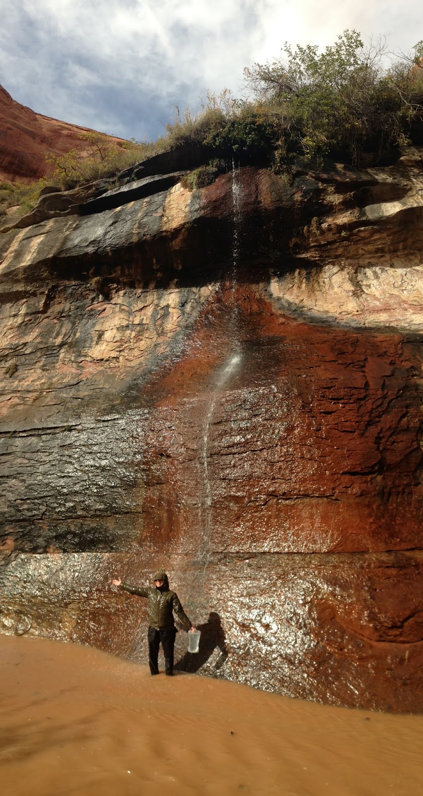 | Waterfalls and hanging gardens (in the alcove behind me) make this landscape a fun place to explore and play. |