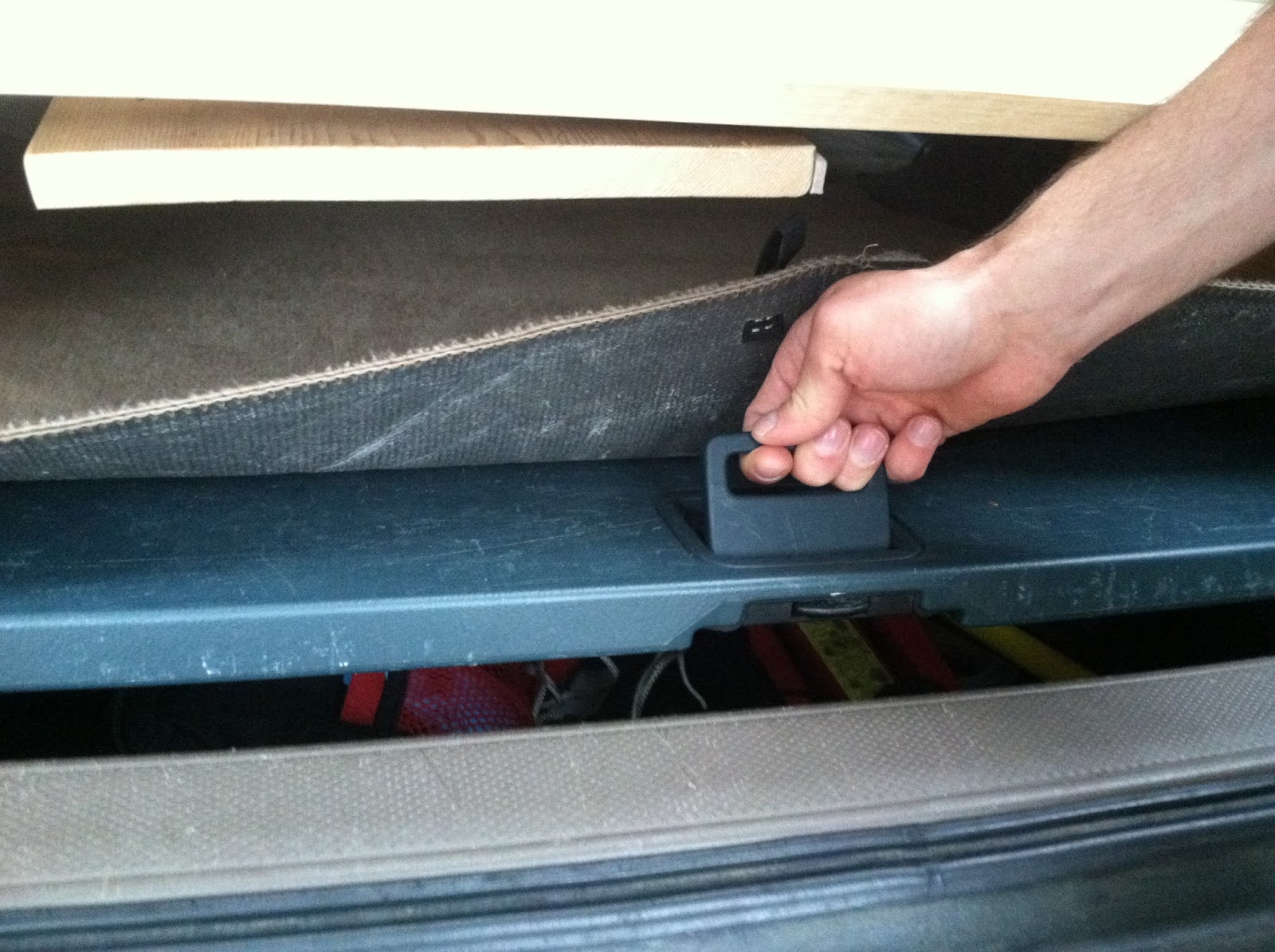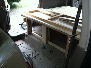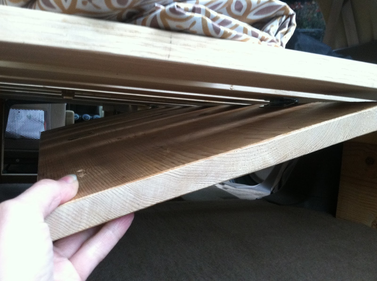 Under the carpet, there is a folding table that we can pull out to cook on, etc. In order to access it, Logan made the center support hinged, so it can fold up to access the table. It has a cabinet magnet to hold it up. Fancy.