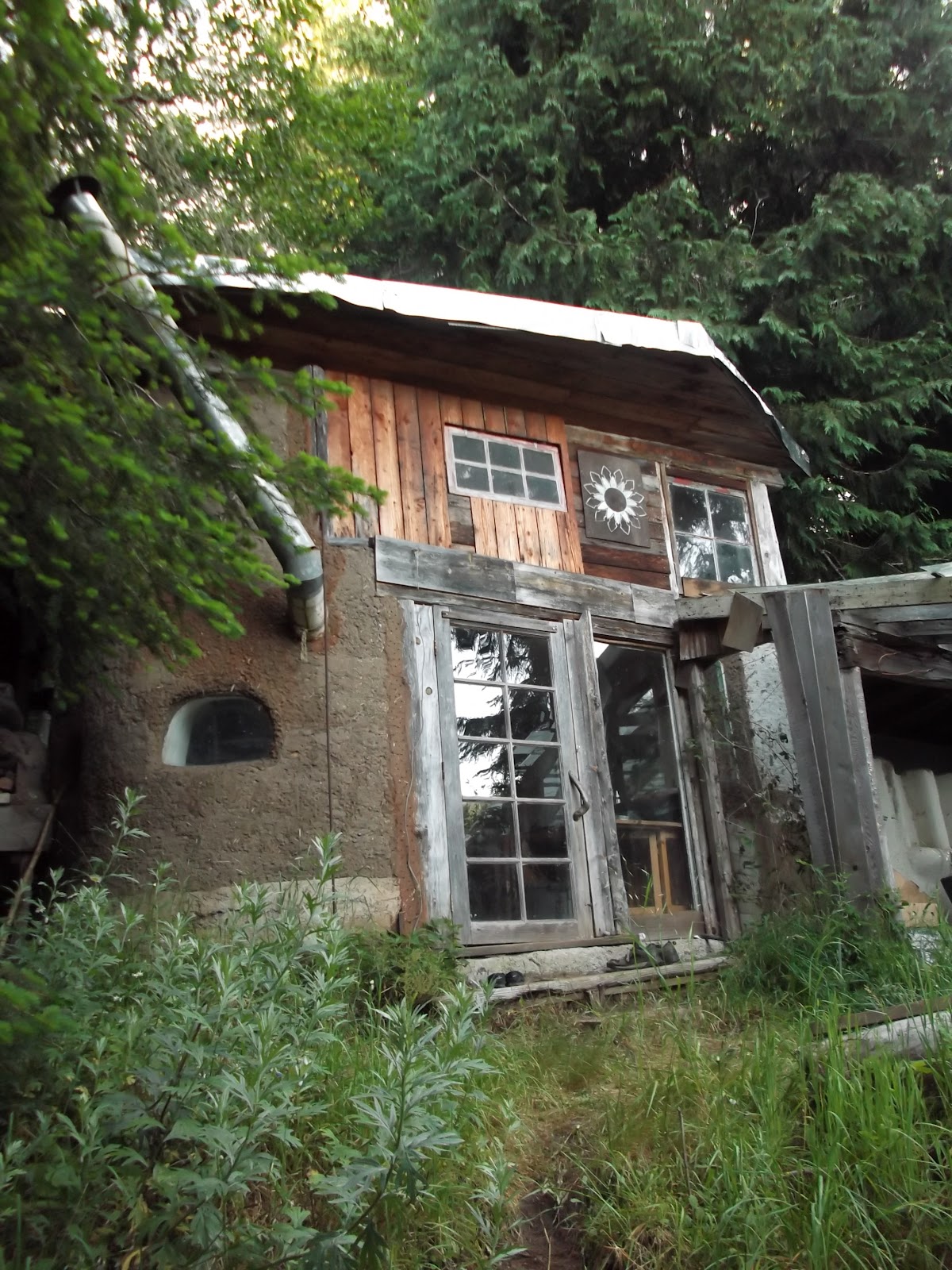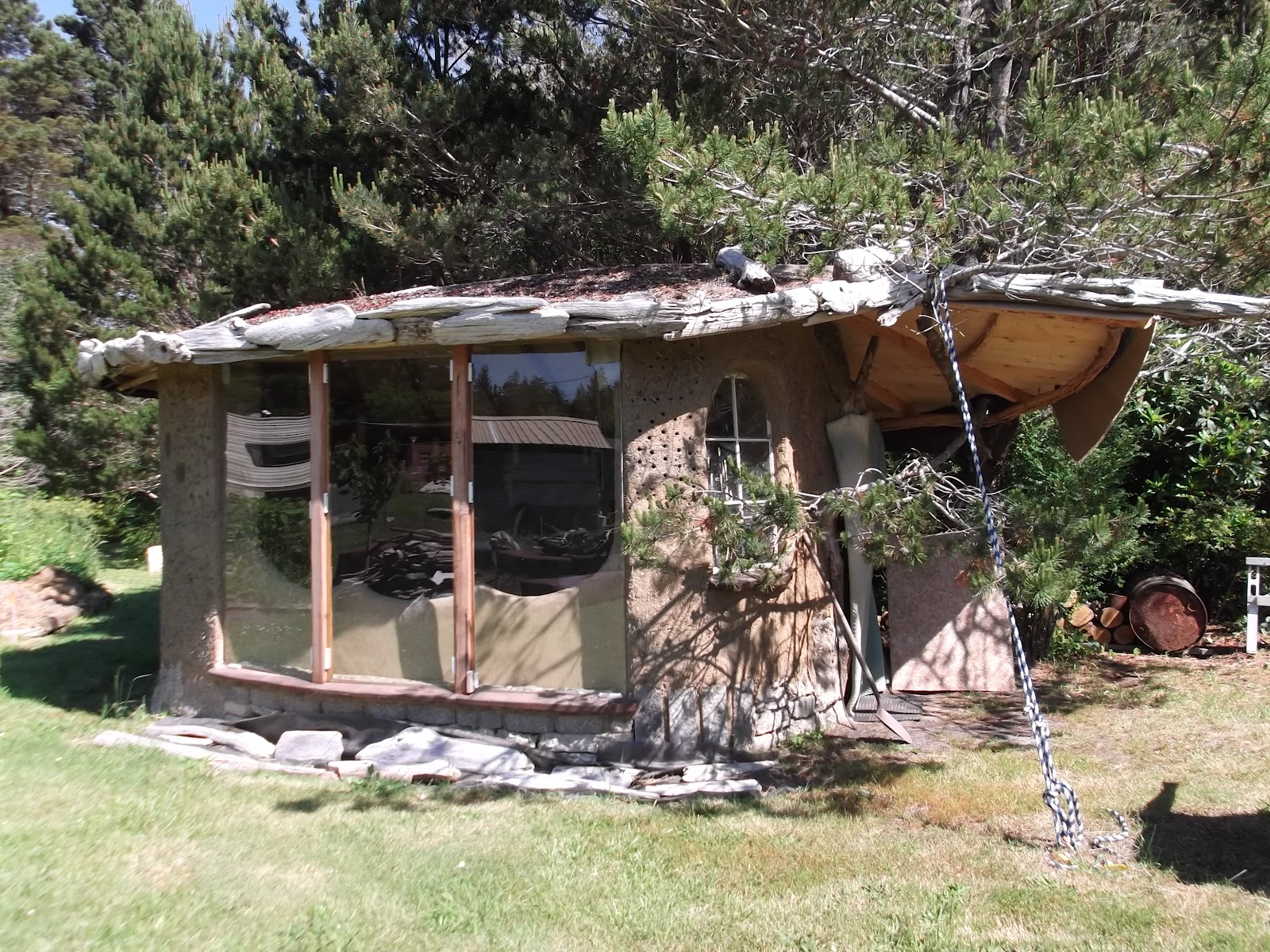 The house that Linda lives in at Cob Cottage Company is supposed to be a model house of what a couple could build in one year with just over $5,000. It is a beautiful example with all sorts of beautiful materials including a loft, bathroom, kitchen, and rocket stove mass heater. It was recently featured in the Wall Street Journal in their review of the new book, Tiny Homes.