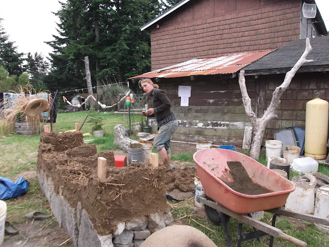 Now, there is another Complete Cob Workshop going on, but this one is off site.  It's in Bandon, OR, about 40 minutes away, where Logan and I had been visiting on our days off.  We decided to come out and help with that course.  Here, we are building a garden wall, which will create a space outside in the sun, but protected from the high winds coming off the ocean.  Here are the participants in action: