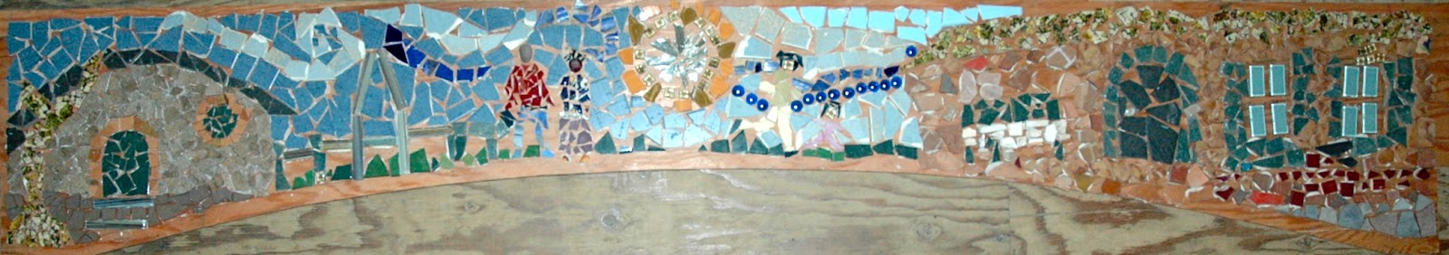 I was interested in doing a little with mosaics as well, so as my final project, I finished off the tiling on this natural housing-themed mosaic, along with a couple of others, using donated and recycled tiles, which I broke up and glued to plywood. It will later be filled in between the tiles with grout. I tiled the sky and grass.