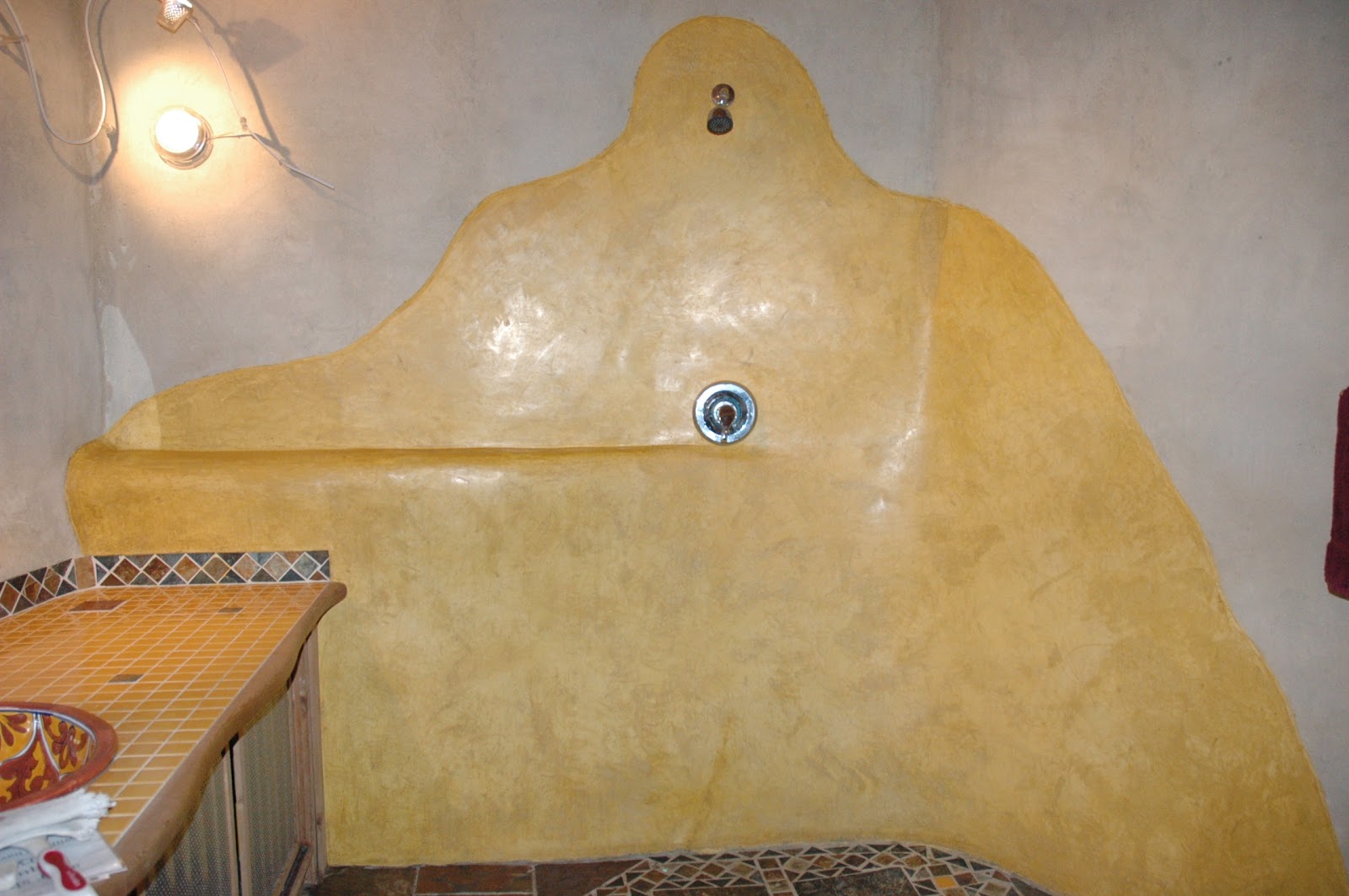 Next, I was able to put my new Tadelakt skills to work... There was a repair job needed in the Healing Sanctuary shower, so I set to work on a patch about 4" wide x 12" long x 1" deep and a crack that had formed (from an earthquake?). Where the patch was needed, the substrate (lime plaster under the Tadelakt) had not been adequately attached to the wall beneath it and had separated, causing cracking in both surfaces. So, I removed an area and made sure to attach the new stuff. It was much harder to work in such a small area and to do get a smooth surface between the patch and the wall when compressing, but all in all, I was really pleased with the result.