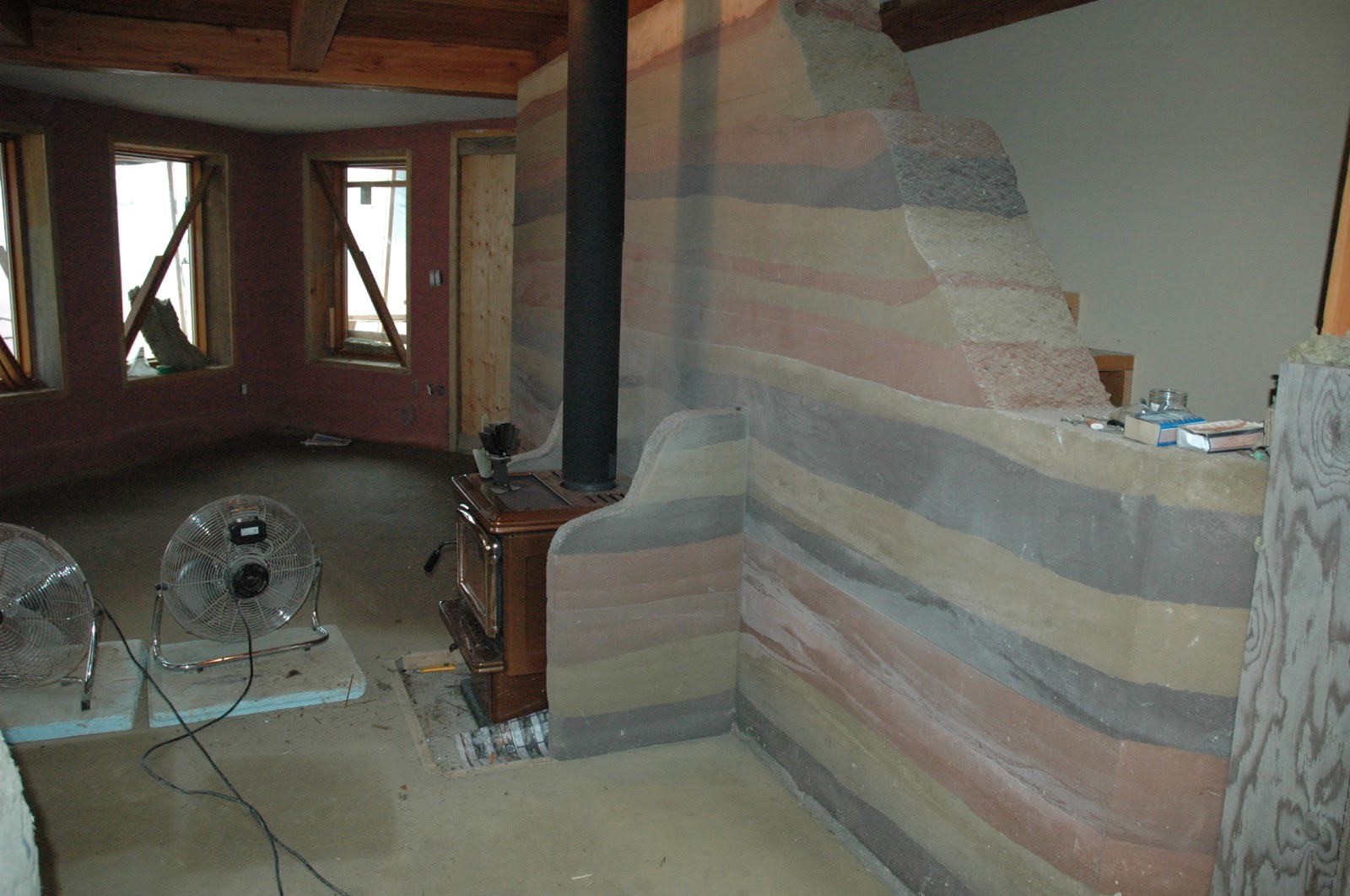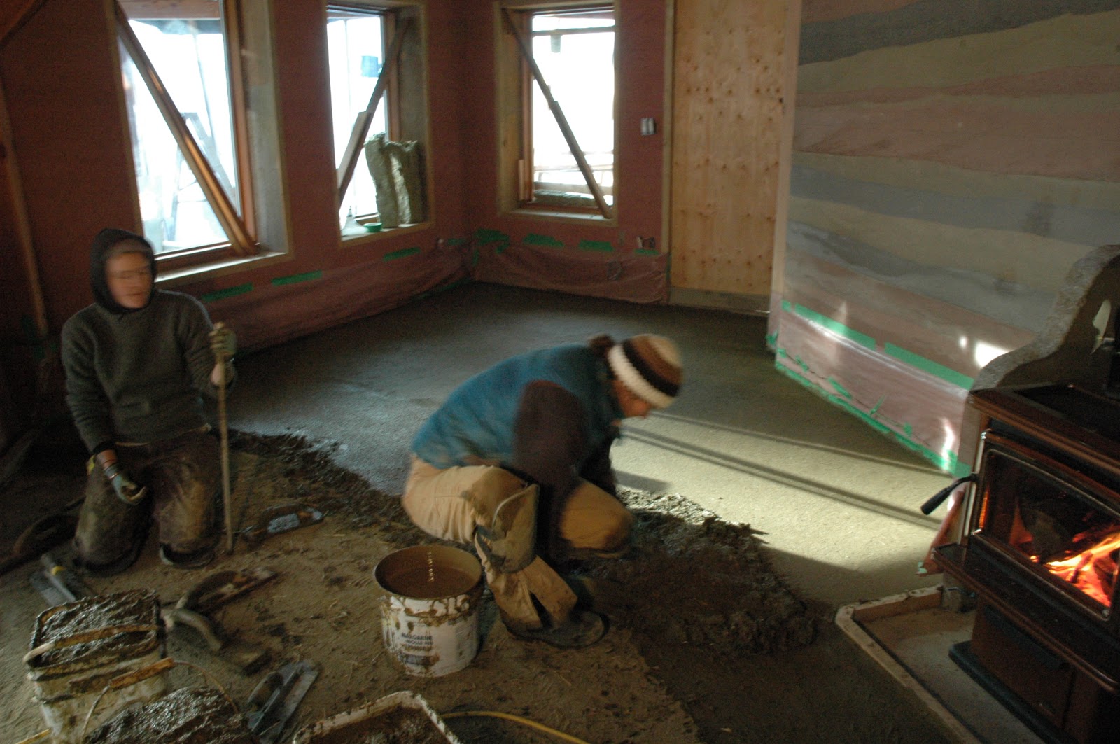 First, I helped install an earthen floor. It's true, winter is not the best time for this project, but since the owners really want to move in this March, they wanted to make it happen. So with a wood stove and some fans, it was almost dry when I left. Ayla came in to help with this and a woman named Ann was leading the project. The earthen floor mix is similar to earthen plasters, with sifted materials, but it has more sand than plasters usually do, to add to its compressive strength and reduce shrinking.