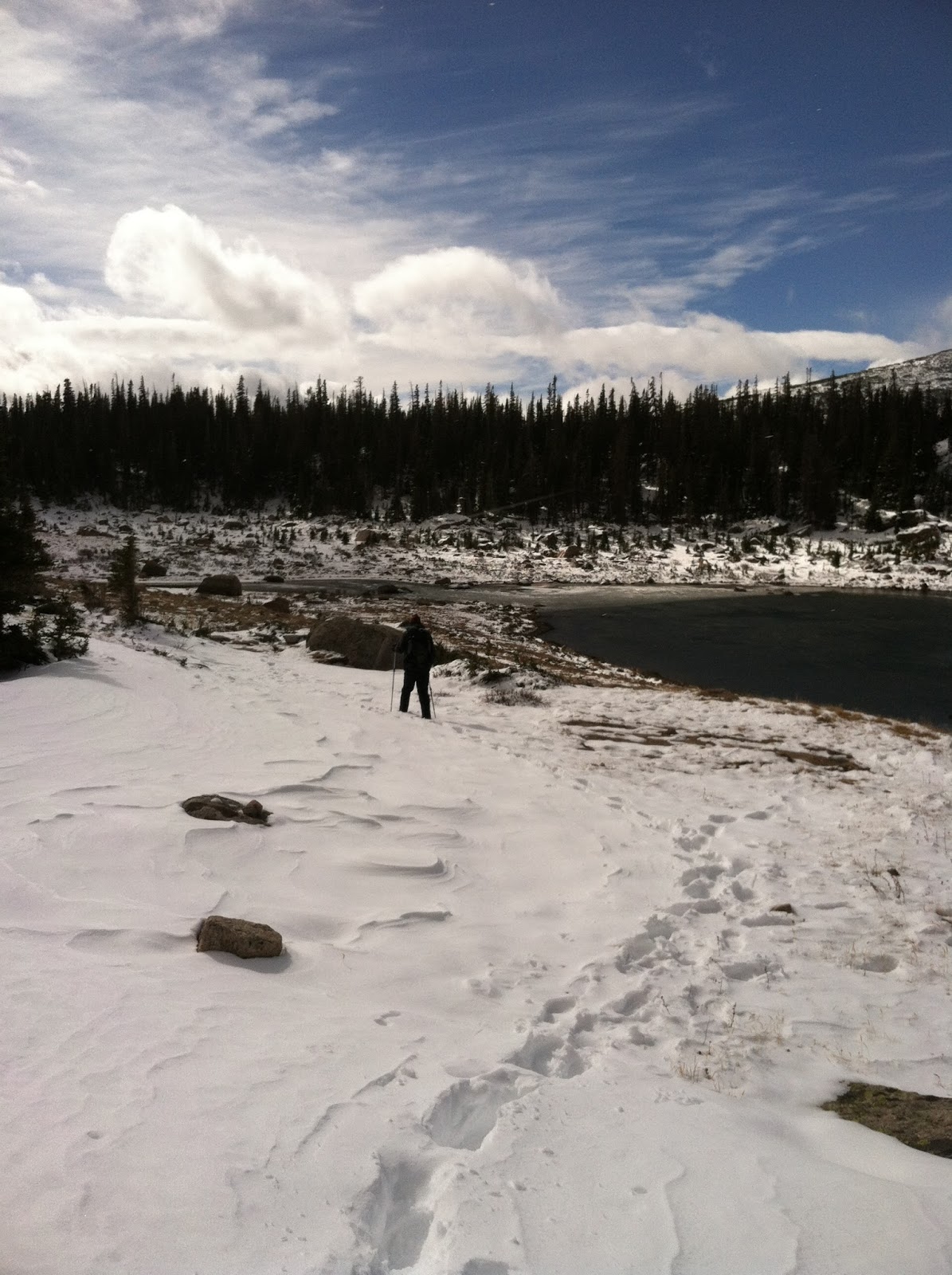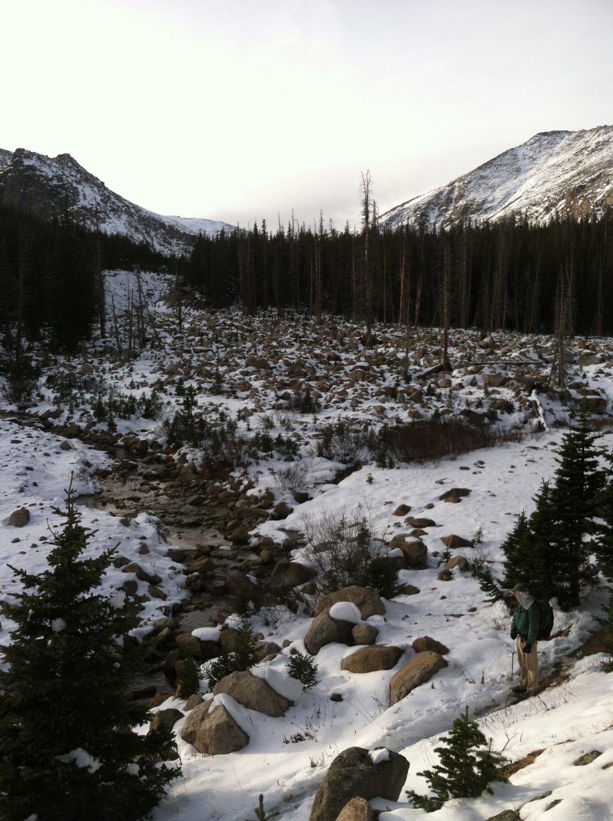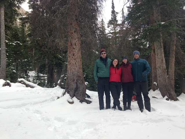 While visiting my sister, I got a call from a good friend who read my blog and realized that per chance we were both in the same area on hiking adventures. So, we went out to Rocky Mountain National Park for a couple of days with Hale and Franklin. How fortuitous to be able to hang out with them and lucky for us our desert hiking gear held up just fine in the unexpected snows we came across! No one (including the park ranger) seemed to know that there was about 8 inches of snow where we were planning to camp on our second night... but that was ok - it was my very first time camping on snow! It is surprisingly cushy and warmer than you might expect.