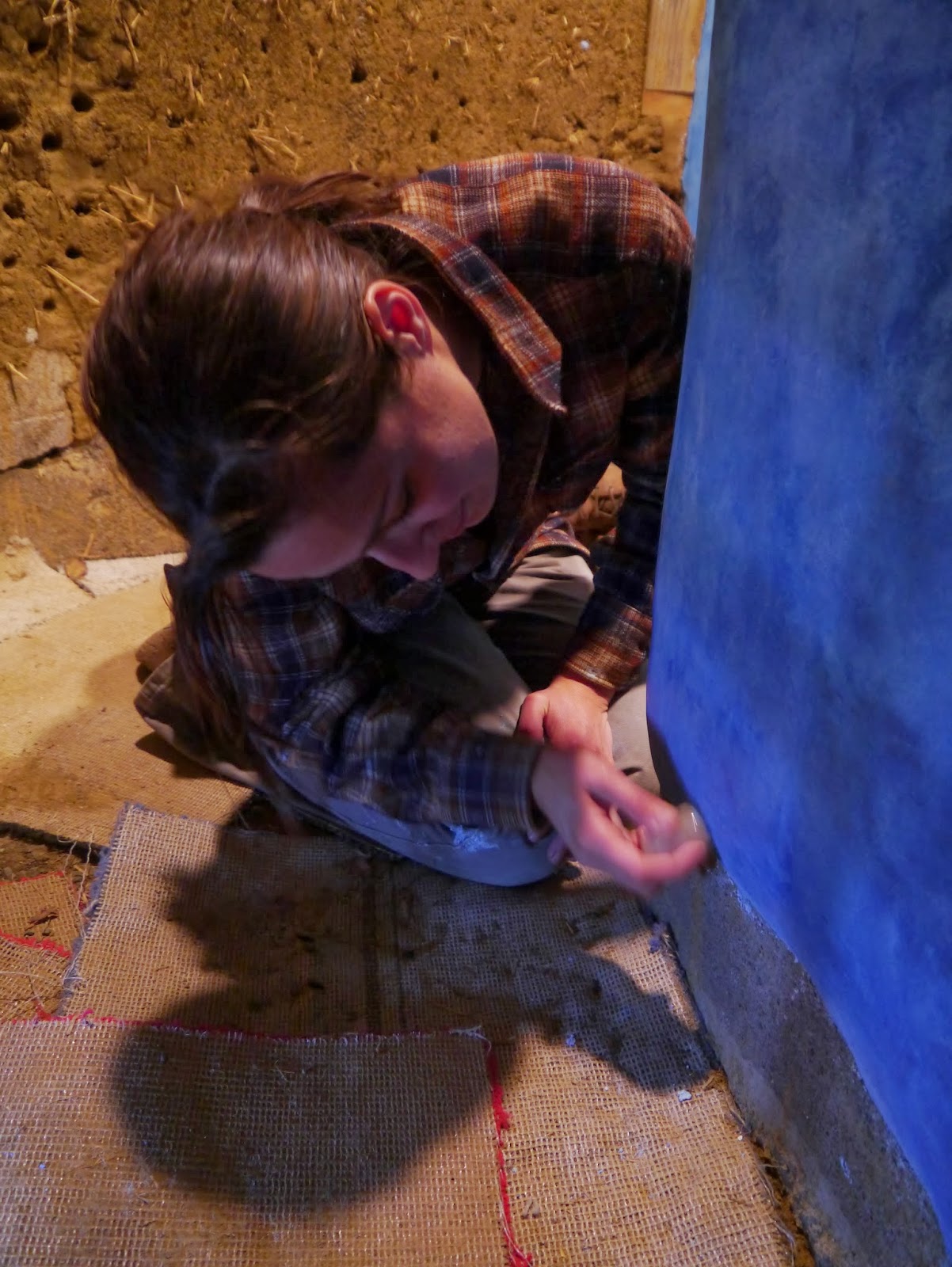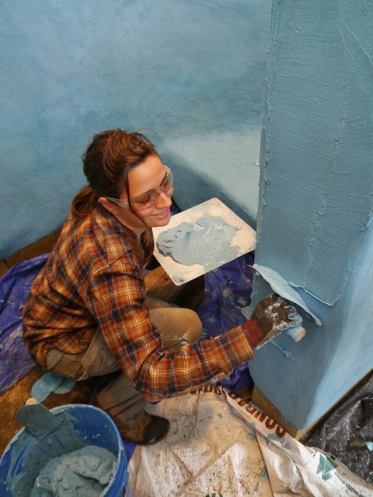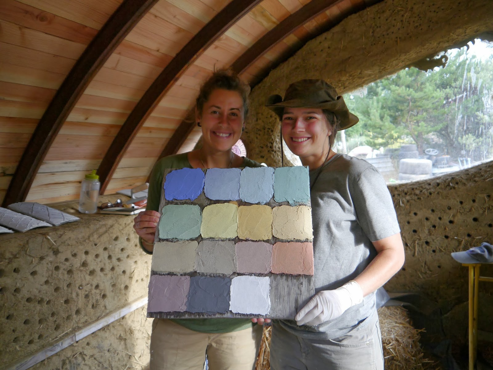 First we made samples of different lime plasters to use as our substrate and our tadelakt plaster. We varied the amount of sand and lime in each to find a good amount of strength, drying, and shine. Then we tested all the pigments that Tammy has purchased to see what colors we were most interested in. We added to and roughed up the earthen plaster (or brown coat) that had been applied over the cob and eventually applied the lime plaster substrate. We also had chosen some colors that we liked for the shower, so we added some "bubbles" to the interior of the bathhouse to test out the tadelakt.