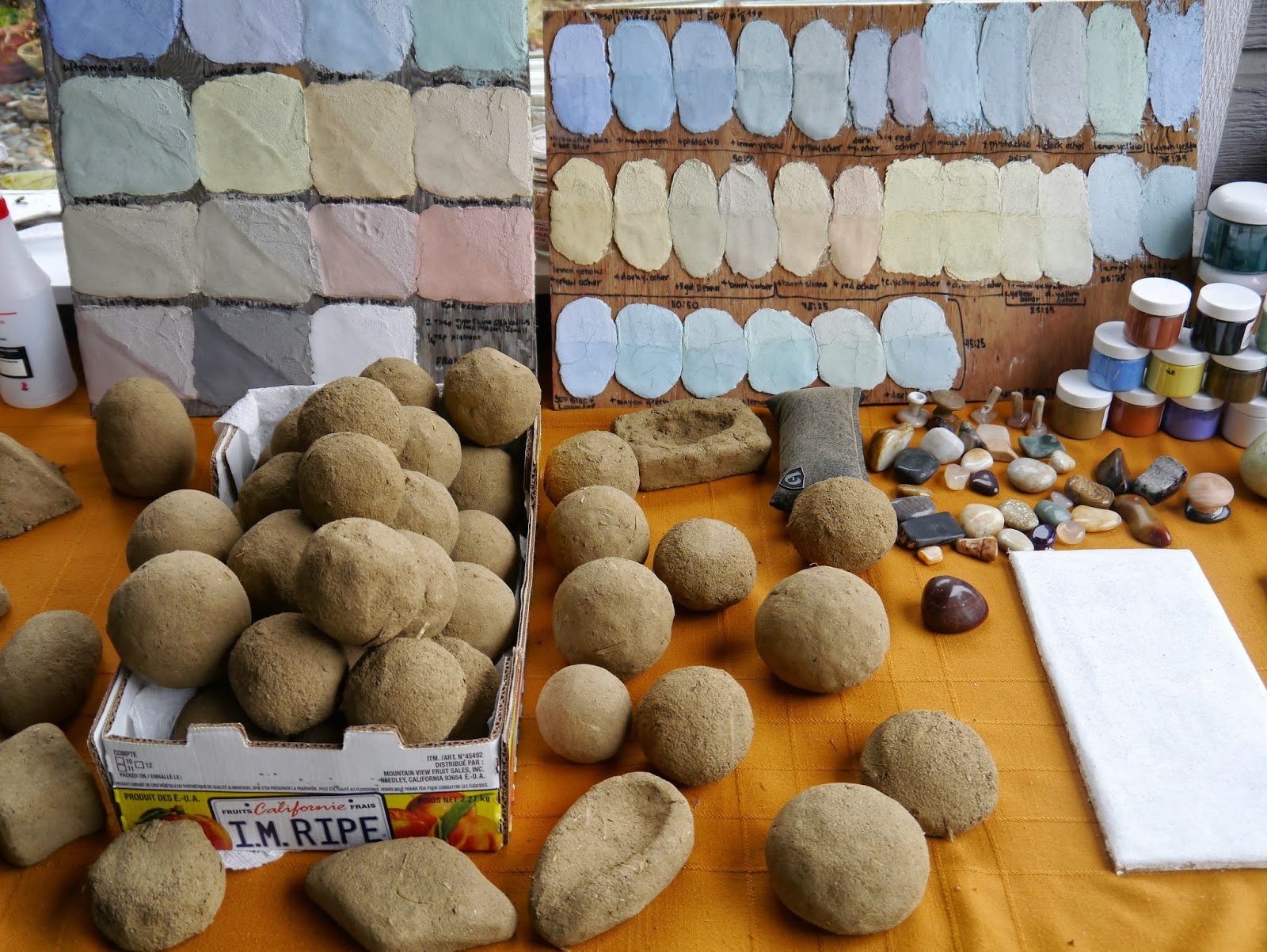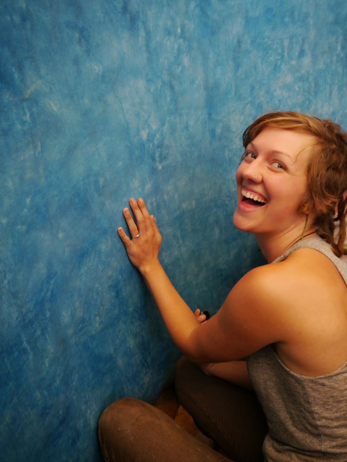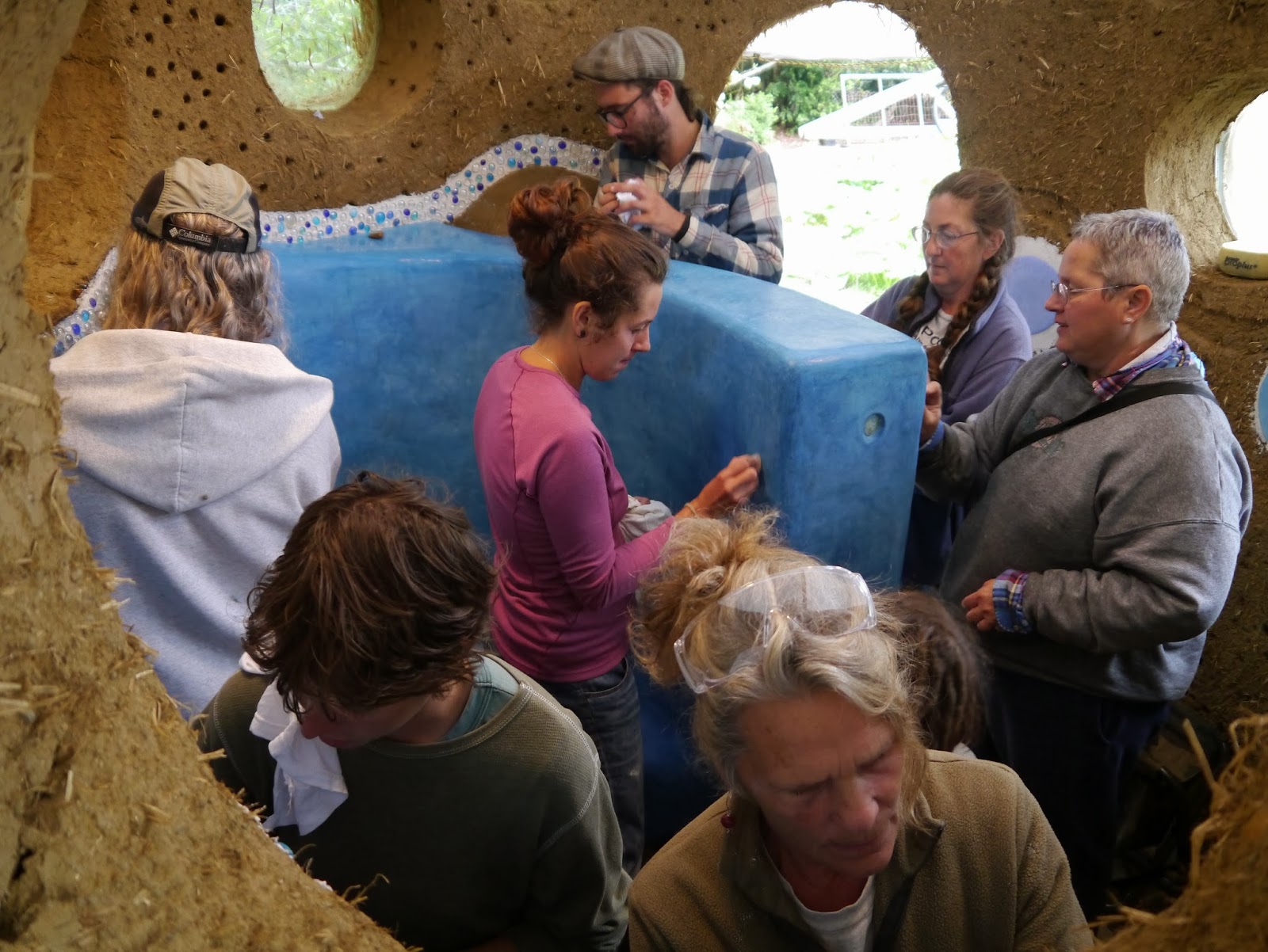 First we made samples of different lime plasters to use as our substrate and our tadelakt plaster. We varied the amount of sand and lime in each to find a good amount of strength, drying, and shine. Then we tested all the pigments that Tammy has purchased to see what colors we were most interested in. We added to and roughed up the earthen plaster (or brown coat) that had been applied over the cob and eventually applied the lime plaster substrate. We also had chosen some colors that we liked for the shower, so we added some "bubbles" to the interior of the bathhouse to test out the tadelakt.