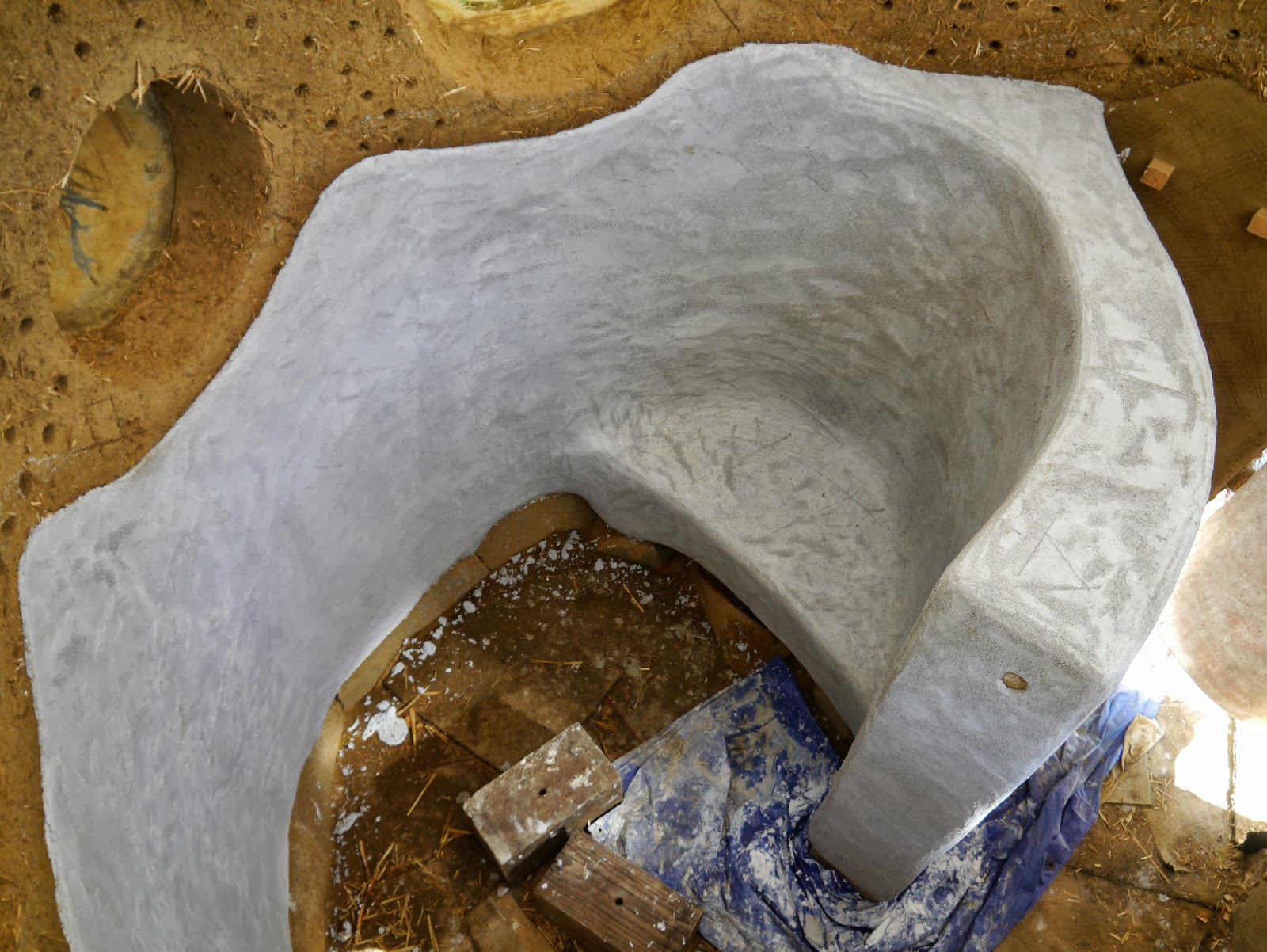 Finished Tadelakt "Bubbles" (the white substrate will be covered up later when the cob walls are plastered) next to the many glass window bubbles |