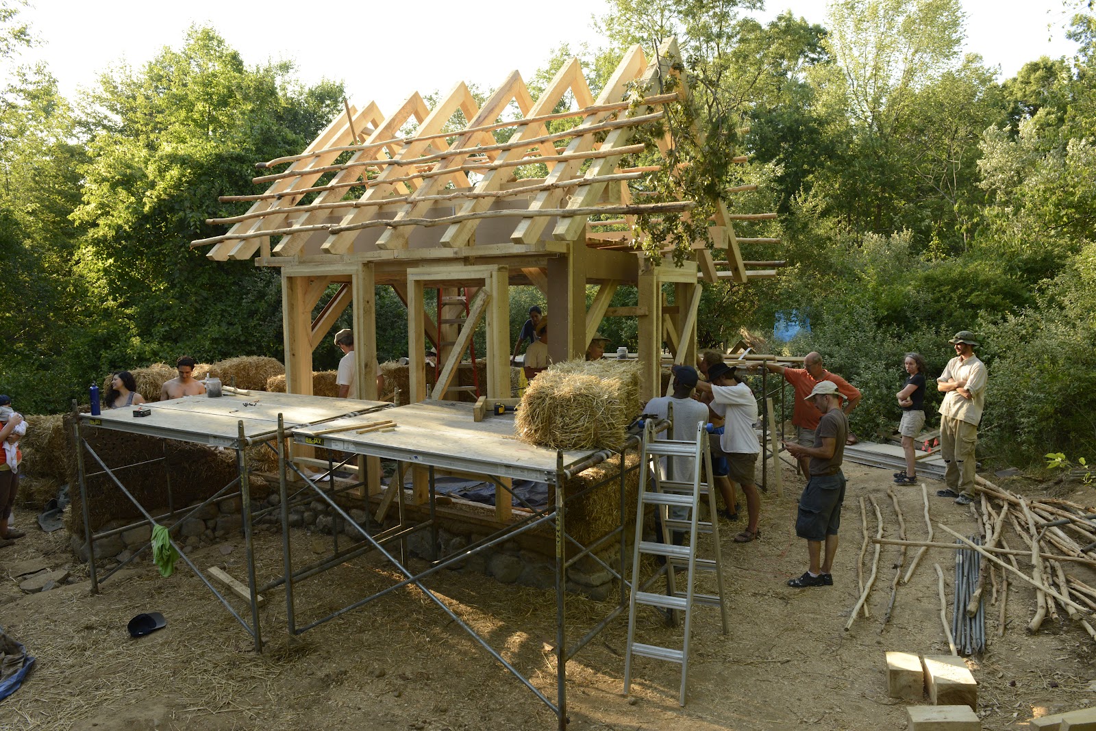 I already shared some images (mostly of the Timber Frame) in the last post, but here are some more to give you a more complete picture of what we accomplished - foundation, stone stem wall, straw bales, plastering, and thatch.