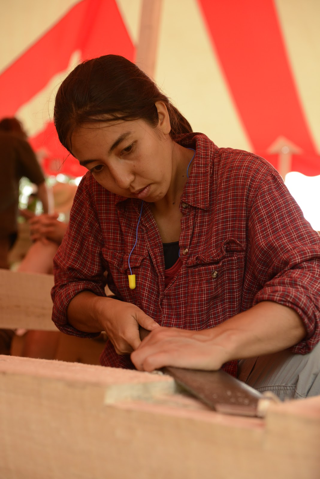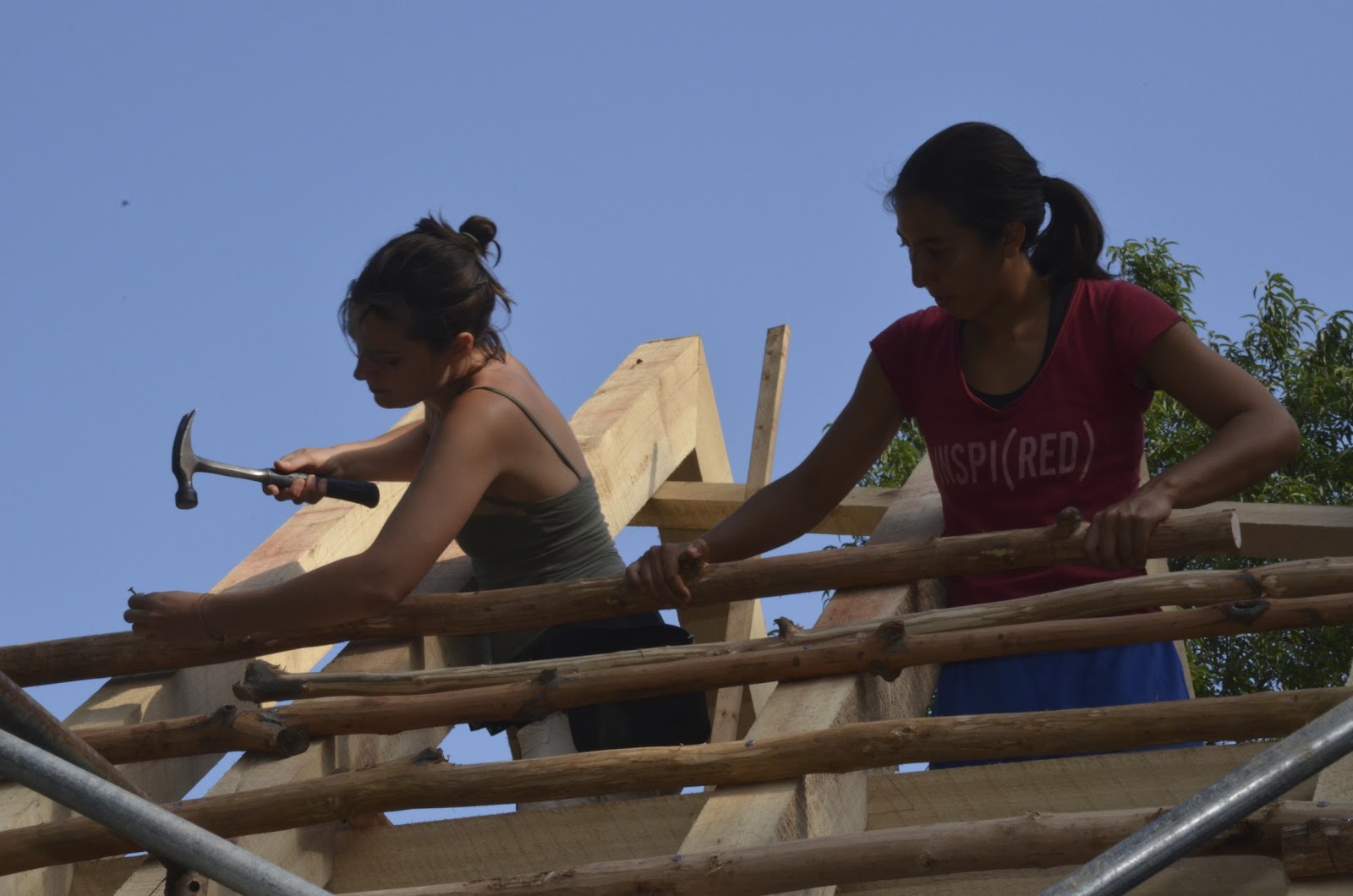 | Miwa and I are attaching the perlins to the rafters to support the reed thatched roof. (photo by Eva Wimmer) |