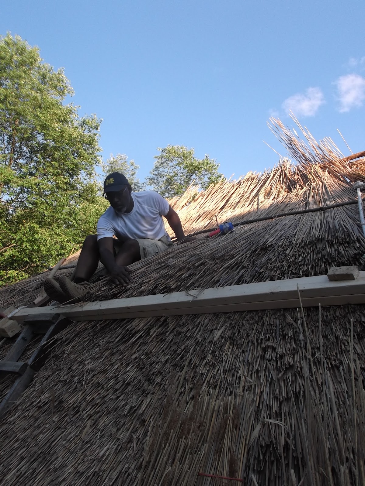 | Michelle and I were adding the final bundle of the workshop. Each bundle gets placed, untied, spread out and pinned in place with a needle and wire that gets passed through the roof and around the perlins. It is also tied down with a long thin stick, called a sway. you can see the sway holding the fourth row in place in this photo. |