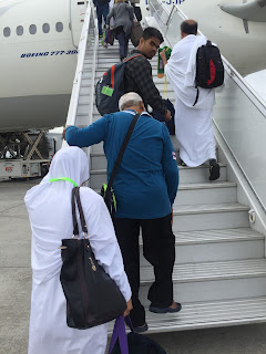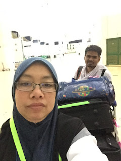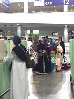 Apabila sampai di airport macam-macam hal pulak, jadi lambat. Urusan beg melambatkan kami terutama encik suami dan abah yang belum tukar pakaian ihram. Sedang kami nak masuk security untuk ke gate, tetiba Ustaz panggil encik suami keluar semula. Aku pun pening,takkan beg kami problem kot, rasanya tak mungkin ada yang bermasalah. So aku guidelah mak dan abah ke gate dan nak tinggalkan encik suami. Mak mentua aku pulak risaukan anaknya.. nak tunggu juga anaknya takut anaknya tak jumpa gate.. :P . Terpaksalah aku menenangkan beliau dgn menyatakan kami dah banyak tempat/airport dah jelajah, insyaallah suamiku tu tahu mana nak cari gate. Aku terpaksa juga cakap abah mentuaku tak berapa biasa berjalan cepat, so kami memang kena start jalan dulu, takut tak sempat ke gate.. Akhirnya mak mentuaku menurut. Sesampai kat gate, nak masuk toilet lelaki utk abah mentua tukar pakaian ihram tak boleh sebab toilet cuci pulak. Saat itu encik suami muncul, dan dia cakap tukar pakaian dalam flight jer lah sebab takut lambat walaupun sure susah punya nak tukar pakaian dalam toilet flight yang sempit tu. Anyway... semua ini ujian2 awal semasa kami ingin memulakan perjalanan umrah. Encik suami cerita sebenarnya beg kami tak de masalah cuma ustaz nak minta masukkan barang ahli rombongan dalam beg kami tp xdapat juga sebab semua beg dah kunci dan kunci dipegang oleh dua org mem besar.. aku dan mak mentua :P