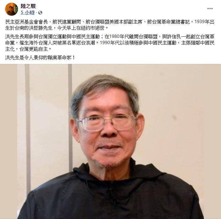 陸之駿最後致上敬意「洪先生是令人景仰的職業革命家」。
