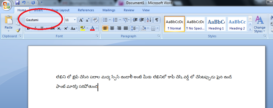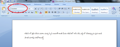 ఇలా  మార్కింగ్ చేసిన తరవాత - మీరు ఎమ్మెస్ వర్డ్ ని తెరచి, అందులో పేస్ట్ చేసుకోండి. అలా చేసుకున్నాక - ఆ వర్డ్ లో పేస్ట్ చేసుకున్న దాన్ని మళ్ళీ మార్క్ చెయ్యండి. అలా చేశాక - పైన టూల్ బాక్స్ Tool box లోని ఫాంట్ సెక్షన్ Font section లో ఫాంట్ ఏమున్నదో గమనించండి. అందులోని డిఫాల్ట్ ఫాంట్ ని మార్చండి. ఇక్కడే మీరు కాస్త గమనించాలి. తెలుగు ఫాంట్స్ కన్నా ఇంగ్లీష్ ఫాంట్స్ ని అక్కడ ఎన్నుకుంటూ / మారుస్తూ వెళ్ళాలి. అప్పుడే పదాల మధ్యన మరింత ఎడం ని సాధించగలం.