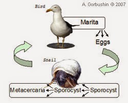 Sağlıklı salyangozlar gel-git olaylarını dikkate alarak hep deniz düzeyi altında kalmayı başarırlar ve çok nadiren martılara yem olurlar. Ama parazit taşıyan salyangozlarda, parazitler olgunlaştıkları dönemde öyle bir kimyasal madde salgılarlar ki, salyangozlar bu kimyasal madde etkisiyle zombileşirler ve deniz suyu üzerine çıkacak şekilde davranmaya başlarlar. Martılar da bu salyangozları yiyerek, ergenleşmeye hazır parazitleri bünyelerine alırlar ve parazitin yaşam döngüsü tamamlanmış olur. (McCarthy ve diğ.2000),
