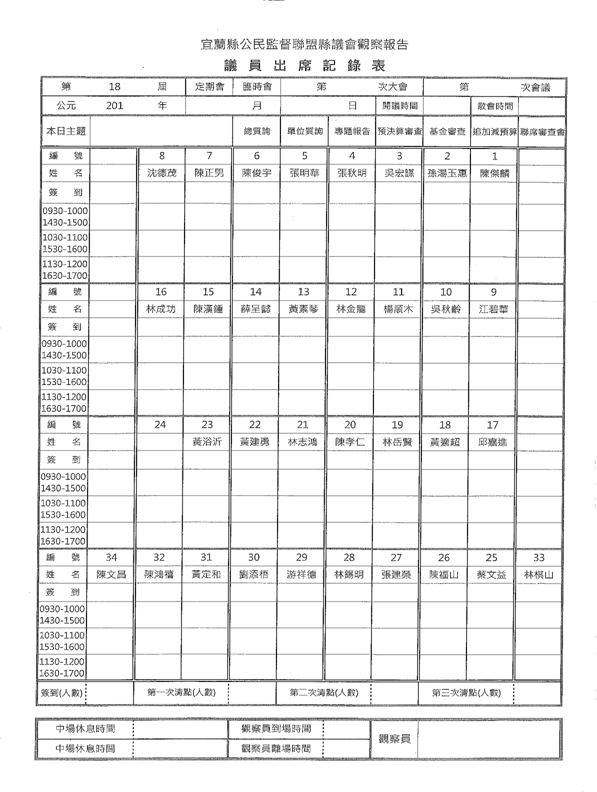 社團法人宜蘭縣公民監督聯盟 宜蘭縣議員2017上半年問政表現觀察總報告 文/社團法人宜蘭縣公民監督聯盟 壹、前言 2011年成立的『宜蘭縣公民監督聯盟』(簡稱「宜督盟」)本著公平、客觀精神自2013至2016,共辦理了四次議員評鑑,促成宜蘭縣議會成為全國透明度第二高的議會。今(2017)年,將議員評鑑改成議會觀察,要用明確數據,針對過去選民較少注意議員的在場率、質詢內容、專題報告專業度、聘請助理額度、建設經費運用等面向,為選民呈現客觀的事實與數據,讓選民得知自己選區議員的整體表現。 宜督盟為揭開議會長期以來,簽到出席率雖高,實際在場率卻低下的事實,透過這次議會觀察報告有詳盡的數據與資料,呈現所選出的議員在開議期間的參與度與在場率是如何,以供選民參考。 議員在議會的質詢是不是言之有物,一直是宜督盟所關注的焦點,宜督盟曾多次對質詢次數質詢內容加以評分評鑑,本年度開始,以開議一個月期間,每星期選出有效質詢影片,內容有憑有據,獲選之議員也善加利用其質詢影片廣為宣傳,以期帶動議會質詢內容品質的提昇。 為使不負所民所託,宜督盟在本會期要求議員應公布所聘的助理名單、建設經費去向,在本報告書中,可以看出哪些議員已走在時代的前端以示向選民負責。 議會在開議時得要求縣府在會議期間針對特別議題提出專題報告,這一向是縣民及媒體所最關注的焦點,也是展現議員們有沒有做功課、縣府有沒心決解問題的參考指標;過去宜督盟較少在此處著墨,今年觀察報告特別增加對專題報告的分析,以檢驗議員及縣府的專業能力。 宜督盟一本初衷,希望議員好,督促縣府更好;這份報告希望縣府及議會資料「全都露」,提供議員、縣府官員及關心政治的朋友們參考,期許現任議員知所榜樣及警惕,也期待更多公民一同關心公共事務,加入公民監督行列。 貳、觀察方法與實施: 一、為回應宜蘭縣議會對宜督盟評鑑辦法之各種意見,經宜督盟2017年1月8日第二屆第十六次理監事聯席會議編號10決議,廢止「宜蘭縣議會第十八屆定期會議員評鑑辦法」,並新訂「宜蘭縣議員問政表現觀察報告實施辦法」(如附件一)持續監督議會。 二、原評鑑辦法主要以議事錄為評鑑工具,議事錄出刊時時效已過,恐有失真之虞。 三、評鑑所需為民服務資料,多數議員認為恐有涉及個資問題,提供意願不高。 四、本次由評鑑評分改為觀察公布,乃著眼於客觀數據之呈現,減少人為主觀評分,個別議員表現可由公民經由這些客觀數據及議員質詢影片自行評斷。 五、觀察報告實施辦法主要觀察揭露項目為: (一)出缺席(依當天議事錄為準) (二)質詢次數(依當天議事錄為準) (三)公共性議題質詢影片彙整及公布,供公眾檢視討論 (四)公布助理名單(如附件二) (五)公布基層建設經費。 六、依每年上、下半年兩階段各彙整成觀察報告,上網公告提供縣民參考,期許建立一個議員表現觀察平台,經由網路讓公民充分討論,達到全民監督之目的。 七、每天分上、下午各派1-2位志工至議會觀察,依議員出席紀錄表(如附件三)、議員表現紀錄表(如附件四)撰寫觀察紀錄,定時點名、拍照、提內部討論後,上傳宜督盟臉書粉絲專頁。 參、觀察與分析: 一、出席表現觀察報告《100%的出席簽到率與48%的實際在場率》 (一)議員出席會議乃是天職 很多公民可能不清楚,我們所選出來的代議士,必須在每年的五月和十一月於議會開會,就像上班族進公司要簽到或打卡;我們選出的代議士也要簽到。只是這樣的簽到,時常流於形式;且只要簽到,就算沒有進議會開會,除了每月固定18萬的薪資(含助理費),每天還可以多領2,450元的補助費(出席費1,000元、交通費1,000元、膳食費450元),中午議會還會供餐,還有議員的單人宿舍可供住宿(宿舍就在議會旁一棟深咖啡色的建築物,除了設備齊全的單人套房,還有健身中心、聯誼室、洗衣房)。 目前針對議員只簽到、就算未實際出席會議也可以領出席費2,450元一事,並無法可管,也就是說,議員們在法律上是站得住腳的。但請各位想想,我們選出議員不就是要監督縣府施政嗎?一年有12個月,僅兩個月定期會,議員們卻以跑紅白帖、為民服務、學業等各式各樣理由未與會,莫非議員助理的能力與人力都不足以處理紅白帖或服務案件嗎?連開會都不到場還領出席費,縣府的施政形同無人監督,這樣說得過去嗎? (二)在場率統計 有一句話說得好:『道德能彌補智慧的缺陷,但智慧卻永遠不能填補道德的空白。』不管議員們有三頭六臂的能耐或自以為是可以遙控監督縣政,這種道德上的瑕疵,促使宜督盟必須就議員實際出缺席狀況做完整紀錄,呈現在各位公民眼前。 宜蘭縣目前有33席縣議員,宜督盟志工於今年五月議會開議期間,每日輪派志工到議場監督,一天點名六次。並製作成整個月33席議員的點名統計表。 宜督盟本次公布五月開議期間,議員實際在場率60%以上名單及30%以下名單。 在場率60%以上名單如下:黃定和、林志鴻、陳鴻禧、吳宏謀、吳秋齡、陳漢鍾、張秋明。 在場率30%以下名單如下:林金龍、蔡文益、林岳賢、陳孝仁。 (三)期許議員有守有為 一個健全的民主體制得來不易,議員們千辛萬苦參選脫穎而出,選民們確實履行投票義務。然而,這樣反差如此大的出席率和在場率,選民們能接受嗎?若再調閱每日議會的議事錄,不難發現,簽到出席率真的是100%,但整個