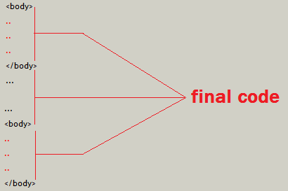 1. search for <body> and replace all the codes between two <body> tags with the final code in the 3rd step. Do it for all <body> tags. See the snap.
