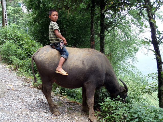 A boy on his water buffalo. The water buffalo seem amazingly passive to allow these kids to jump, climb and play on them |