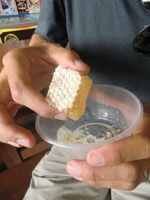 The final stop on the tour was a bee farm. Steph hates bees because she associates them with yellow jackets, and she once was attacked by a swarm of yellow jackets that eventually led her to be sitting in a creek in her underwear, in front of my mom, on one of their first meetings. I find that story hilarious, so by the same association I like bees, so while she hung out in the gift shop I went to look at the bees making honey. Turns out it's not all that exciting - just a bunch of bees packed into a hive. We did get to try fresh honeycomb, which was fantastic. If you ever get the chance to try fresh honeycomb, do it. You don't eat the honeycomb - it's basically wax, but you chew on it and suck out all the delicious honey.