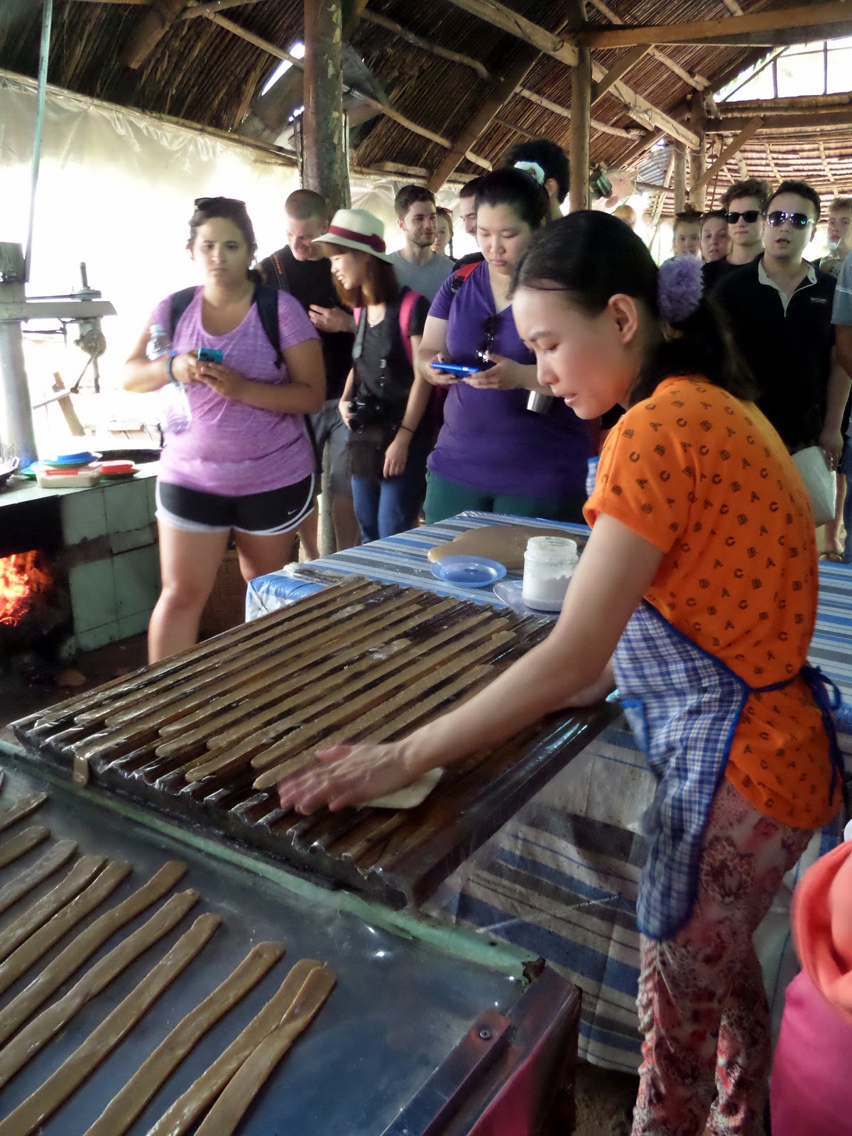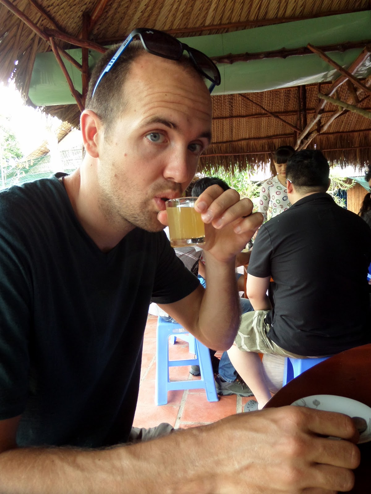Another popular tour out of Saigon is to the Mekong Delta. We were going to go for an overnight tour, but in the end were too worried about our accommodation in the Delta so chose the one-day trip. Overall it was a good day out, but we definitely don't feel like we got to see any of the "real" Mekong Delta - just a collection of tourist activities that make for good pictures. Let's see, we got to ride on a boat, visit a bee farm (with one bee hive), try some coconut candy (think we bought any?), ride in a little cart behind an emancipated horse, walk across a bamboo "monkey" bridge over a tiny little pond, ride in an even smaller boat while wearing a traditional cone-shaped hat, listen to some traditional music, and visit a giant fat buddha statue on the way home. Oh, and of course a handicap center. I'd say the highlight of the day was getting to try some snake liquor - literally a liquor with dead snakes marinating in it. The ingredients list was "Liquor, snake, ..." I tried a bit, Steph just laughed and shook her head. Our guide was, again, very entertaining and even sang for us as well. Maybe I should have been singing for people on my riversurfing trips. Steph says no.
