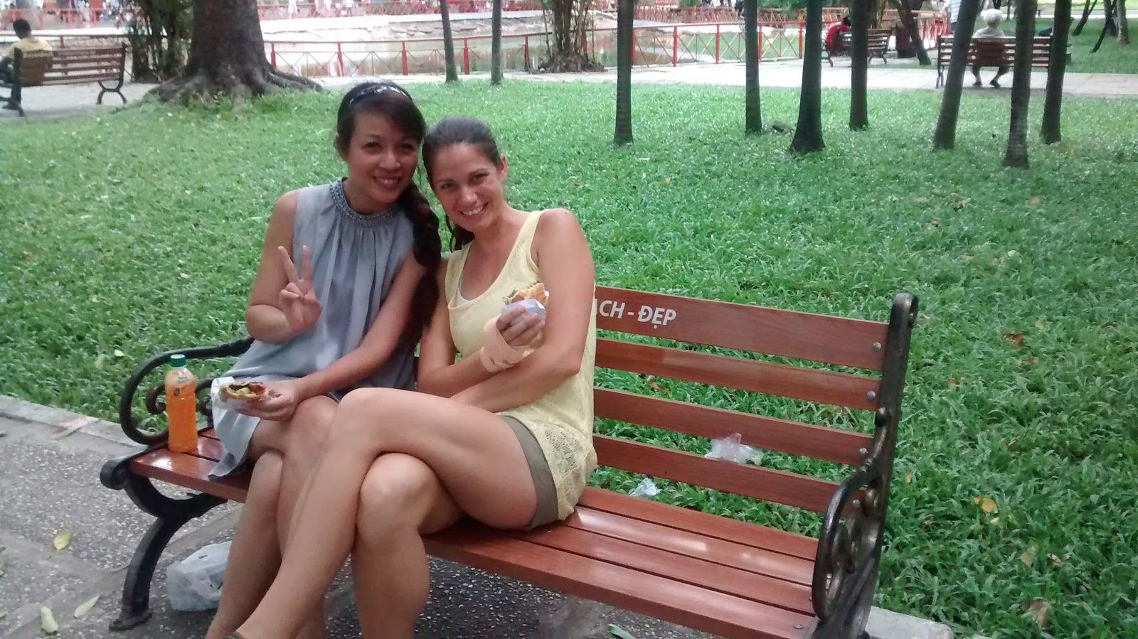 One of the best things about our stay in Saigon was Vy, the host at our guesthouse. She was very friendly and generous with us, giving us recommendations on places to go and things to eat. She even offered to go for a walk with us one night, and led us on a 4 mile trek across the city to a bridge over the Mekong with views back at the Saigon skyline. Afterwards she took us to get banh mi and drink fruit juices with the locals. Another day she took a couple hours of her time to take us to a traditional Chinese doctor to look at Steph's wrist, which has been suffering from tendonitis lately. He lathered some kind of mud paste on there and wrapped it up with an ace bandage, told her to leave it until morning and to take these pills he made from "the tree" with warm water not cold. Okay then. Steph did say that it felt a lot better the next day, but it wasn't the magical cure we were hoping for. He did give a disclaimer though that she waited too long with it bothering her for treatment and it would probably need a few doses. Our last night Vy took us to get a famous banh mi and sat in the park with us to eat them. She was like having a friend in Saigon. It was great.