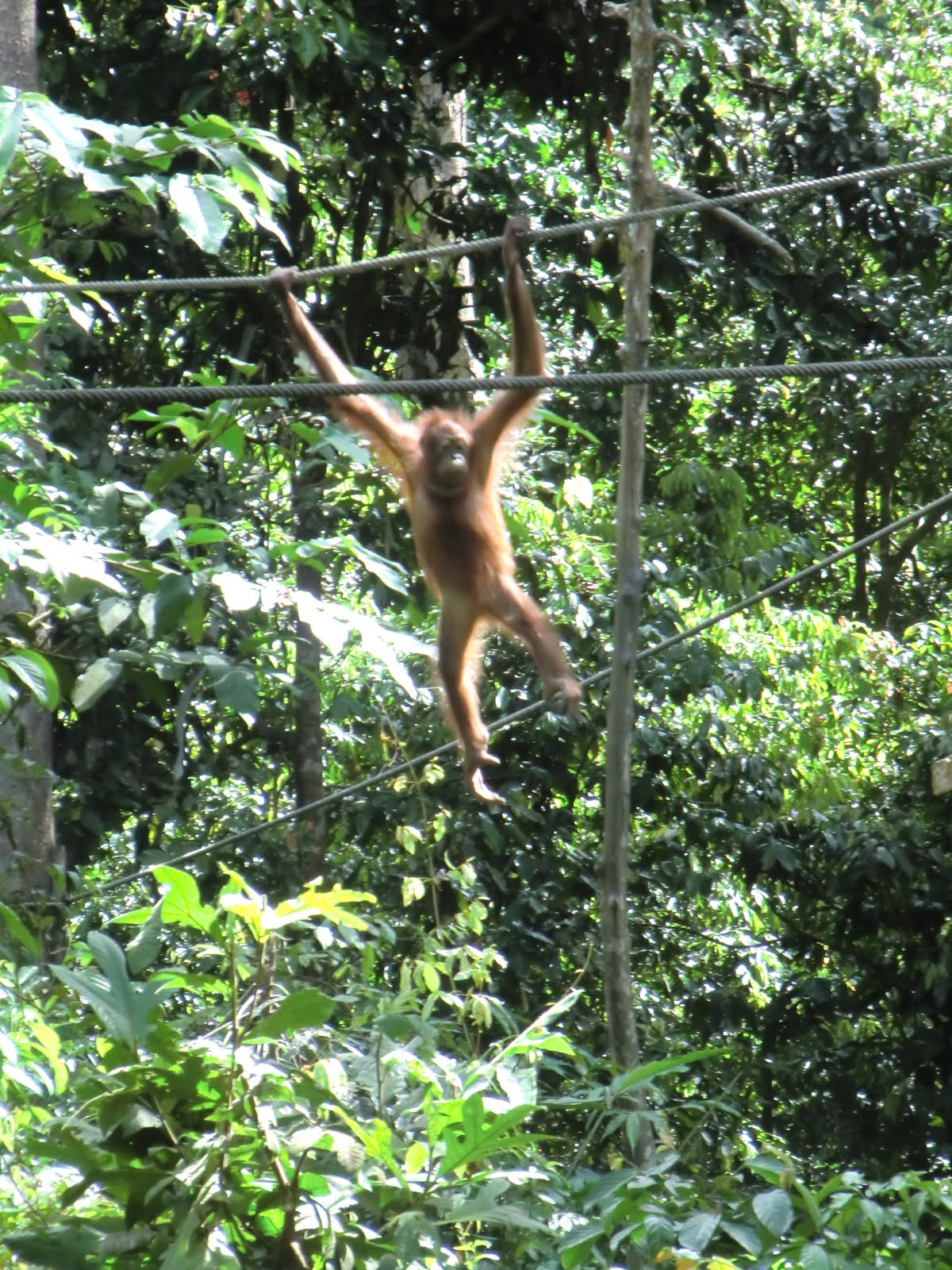 Orangutan Appeal UK if you want to adopt one) and the money brought in by allowing tourists to come in and watch the feedings. We were there for just such an occasion. They have built a platform in the forest where they lay out some fruit twice a day for the orangutans to come and eat. It's not an enclosed forest, so while most of the orangutans that come to the feedings are ones the center is rehabilitating, wild ones can also show up so you never know what you're gonna see. Initially two juveniles showed up and but had to be pretty sneaky in getting some food, which was being guarded by an aggressive and greedy long-tailed macaque.