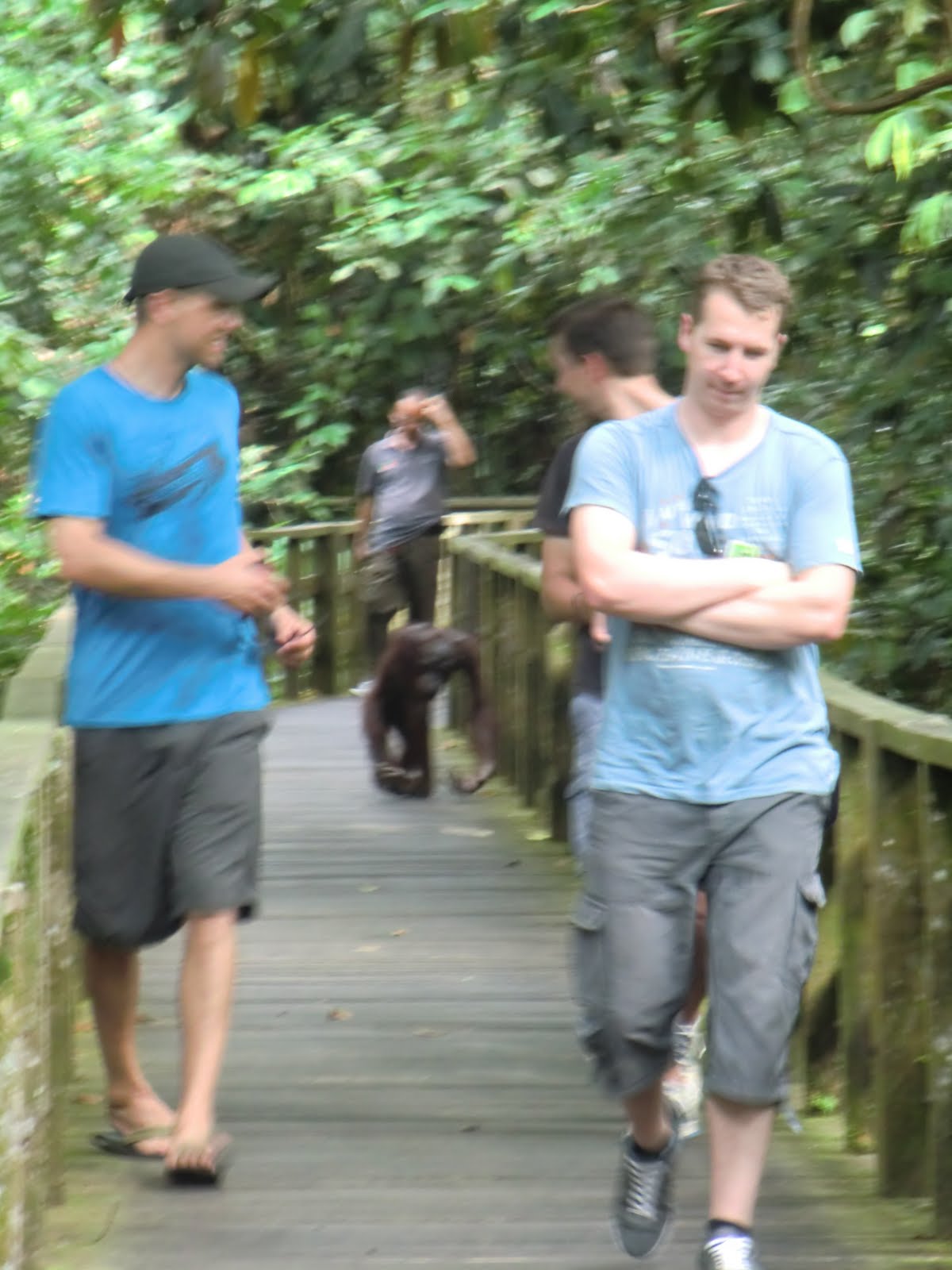 Once the juveniles left we thought the show was over, and many of the tourists left. After about 10 minutes a big male and female showed up for a feed. It was while we were watching them that the resident "naughty orangutan" came walking up the boardwalk behind everybody. He seemed unimpressed by us but did enjoy watching us scatter as he casually walked through the crowd. The rangers were telling us to move out of his way, which seemed pretty obvious until one french lady stood her ground and let him walk right up next to her. It wasn't until the rangers told her that he likes to bite that she finally moved, before the orangutan had a chance to sink his teeth in her leg as I was hoping. This went on for about 5 minutes - orangutan walking around and tourists scattering - until he apparently had enough and walked back down the boardwalk. On problem was, this was also the way out for us. We gave him a few minutes then cautiously followed. We caught up with him at a junction, where a ranger tried to lure him down a different path so we could make our exit. This worked just long enough for us to slip by, but he then decided that he wasn't done playing with the tourists and started following us down the boardwalk. So that's how we found ourselves - getting chased by a naughty orangutan. It wasn't a high-speed chase - he never went faster than a slow walk - but Steph was freaked out nonetheless and wouldn't let him get any closer than about 100 feet. I thought it was pretty cool and could have sworn he only wanted to give me a high-five, but wasn't about to find out. He followed us all the way out to the parking lot and climbed onto the roof of the cafeteria building until one of the rangers walked over, handed him a banana, and they walked off hand-in-hand. So that's what he wanted!