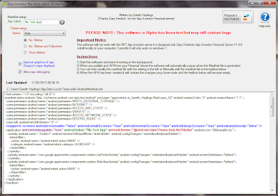 I have updated my App Inventor Manifest Editor software which works in conjuction with the ai4a Personal Server.