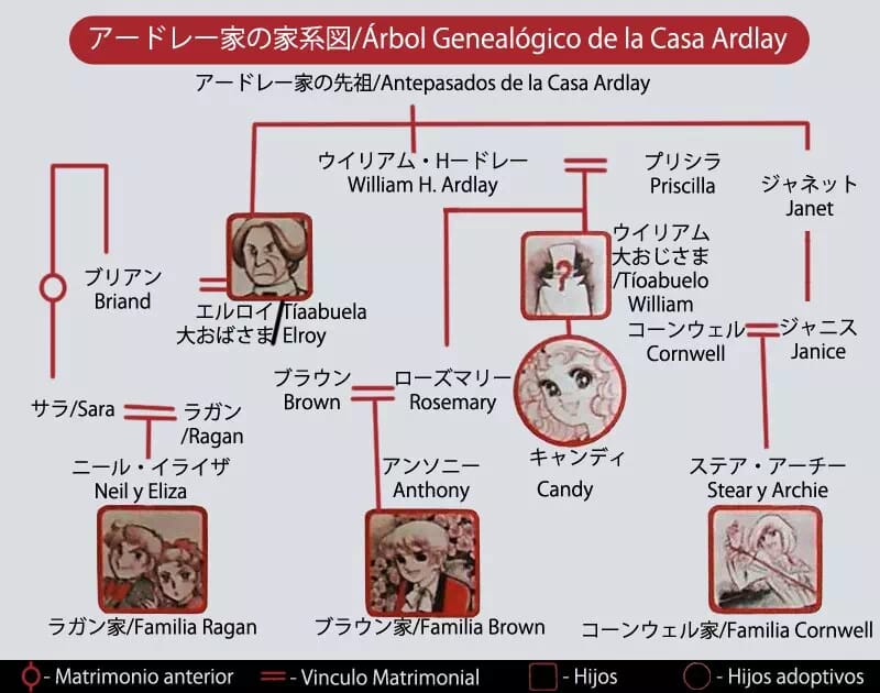 La imagen de la izquierda es la portada y la de la derecha la portada interior. No se pueden distinguir bien los caracteres, pero si unos números, son las edades, Stear y Archie 17 y 16. Candy 6 cuando conoce al Príncipe, del Príncipe no dice, y Candy tiene 13 cuando va a Lakewood supongo. Anthony tiene 16. Eliza y Neil, 13 y 14.