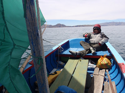 Upon arriving in Copacabana I quickly set out researching a way to row out to the nearby Isla del Sol. I spoke with a local about renting a canoe, but he quickly convinced me that the proper way to get around on the ´highest navegable lake in the world´ was with a sail. He showed me his boat, which was tiny and had a mast and other crucial elements made out of logs and used horseshoes. Although I was a bit nervous about the quality of the craft, and the fact that I had no previous sailing experience, Bolivians can be very convincing, and after a half hour sailing lesson we were hashing out the details of the ship rental. That night we stocked up on provisions and the next day Viviana and I headed out for our three day sailing trip. We started off at 6AM, and the first hour the wind was at our backs and we were cruising along. Another hour later and we were sitting in one spot in the middle of the lake, catching a sunburn and praying for wind. I tried the oars for a bit to help us along, but this quickly filled my palms with tons of little splinters as only a couple inches of each handmade oar had been sanded down. Eventually the wind did pick up, but this time it came right at our faces. Using the zig-zag pattern we slowly made our way toward the island, arriving at 5PM, only 7 hours later than the locals had promised us. The next day we lowered our aim and decided to sail around to the other side of the island, instead of all the way to the north. In just a few hours fighting the wind we arrived. With the help of 5 locals we pulled the boat on shore and hauled our gear up to a small hostal with a humongous view. We cooked our rice and had a couple beers at sunset, then passed out to rest for another long day returning to the mainland. The next morning we recruited a few locals and one other tourist to help push the boat back in. The tourist turned out to be from Washington state, and liked fishing, so we offered him a ride back to Copacabana. This time we made it back in a swift 4 hours. The sailboat trip was truly an adventure, and when we got back all we wanted to do was relax and play it safe.