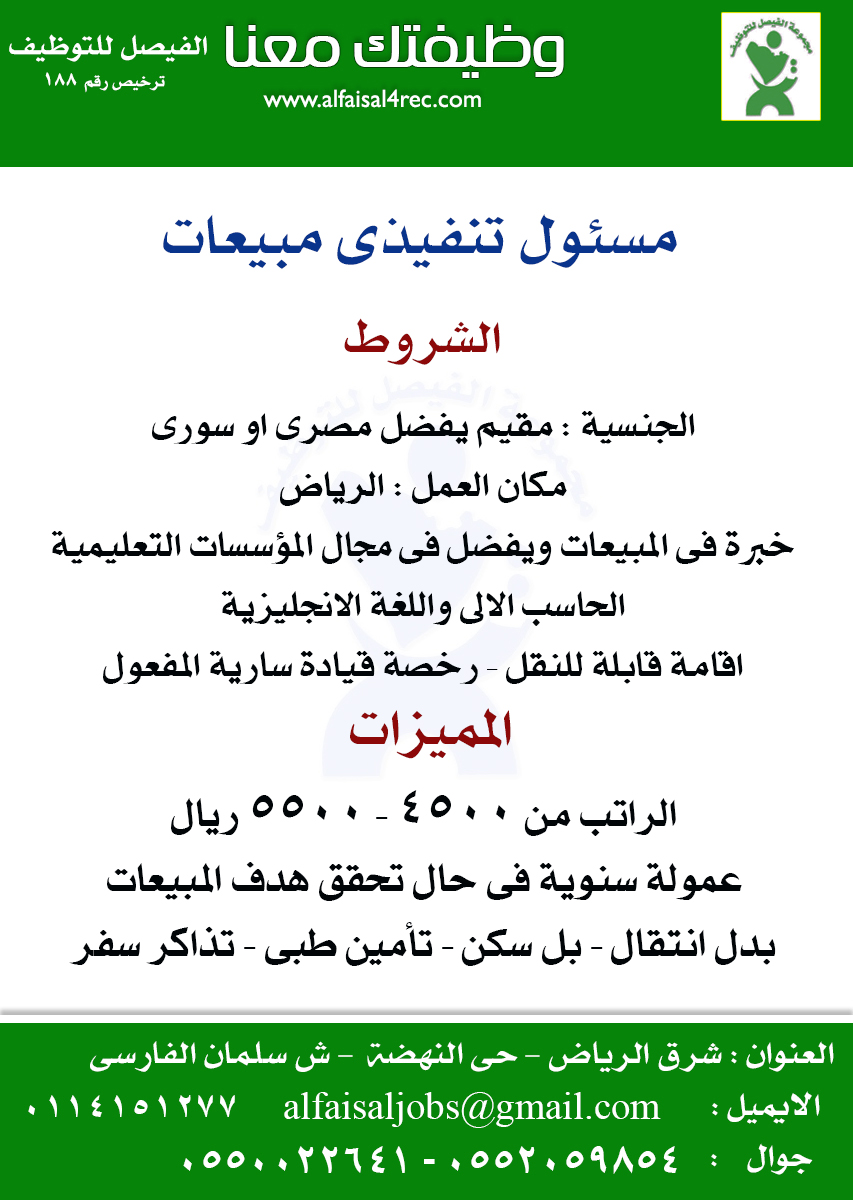 مطلوب مسئول تنفيذى مبيعات فى شركة بالرياض