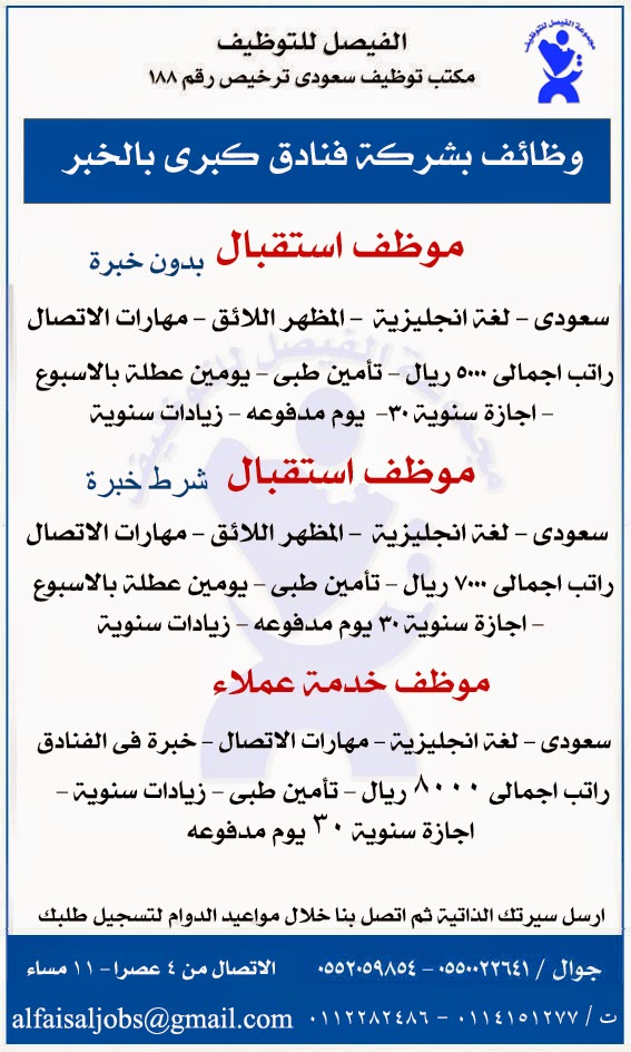 مطلوب موظفين استقبال وموظفين خدمة عملاء فى الخبر