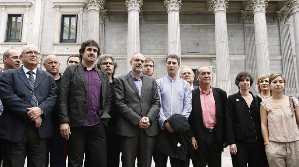 Invitados por ERC, ICV y el BNG a ofrecer una rueda de prensa en el Congreso, el acto ha tenido que celebrarse en la calle al no permitir la Mesa de la Cámara la entrada de los representantes de Bildu.