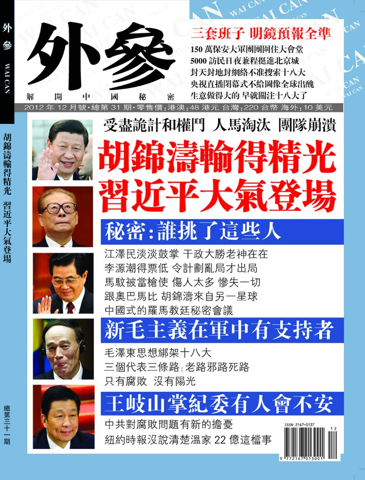 Posted: 17 Nov 2012 03:53 PM PST 明鏡網特約記者 仲祖同 中共十八屆中央委員會已經「選舉」產生,但對各當選人和落選人的票數仍嚴格保密。明天上市的《外參》印刷版披露了部份當選人的得票數,包括習近平、李克強、張德江、俞正聲、張高麗、劉雲山、王岐山七名新的政治局常委,以及被視爲常委熱門候選人的李源潮、汪洋、劉延東。 《外參》長文報導了中共十八大政治局常委和政治局委員的爭奪過程,「遠比外界想像的慘烈。」不過,習近平、李克強始終得到不容質疑的支持,中央委員投票結果也顯示:習近平獲得全票,達2306張;李克強得票也達2305張,僅比習近平少一張票。 在政治局常委中,中央書記處書記劉雲山得票最少。顯示即使在中共內部,他也是在常委中最不得人心的。觀察人士普遍認為,在李長春和劉雲山管制下,中國新聞界受到文革結束以來最粗暴的打壓。劉雲山升上常委,最關鍵的因素是他促成了一本拍江澤民馬屁的英文傳記出版。 而在外界熱傳原本「志在必得」常委的李源潮,在中央委員會選舉中居然比劉雲山更少很多。 李源潮「失常」的消息,最早由《外參》雜誌披露,10月9日明鏡網作了轉報,當時引起廣泛質疑。但至今為止,李源潮「失常」的原因,仍停留在傳說階段,包括傳他包養情婦、受賄、觸犯左派等。明鏡出版社曾出版《李源潮傳》,採訪了不少李源潮的同學、同事,對李源潮均予以很好的評介,外界對他亦有期待。 政治觀察家對明鏡網說,雖然不能說中共十九大李源潮沒有「入常」機會,但未來五年李潮潮以政治局委員之身任個虛職,並不利於未來五年後競爭。 《外參》最新電子版即將出版,如果你是長期訂戶,可較早獲得其獨家內容。 《外參》月刊電子書 (台幣訂價。接受台幣、人民幣、美金付款) http://www.pubu.com.tw/magazine/165?apKey=fedd22f528 ![]() |